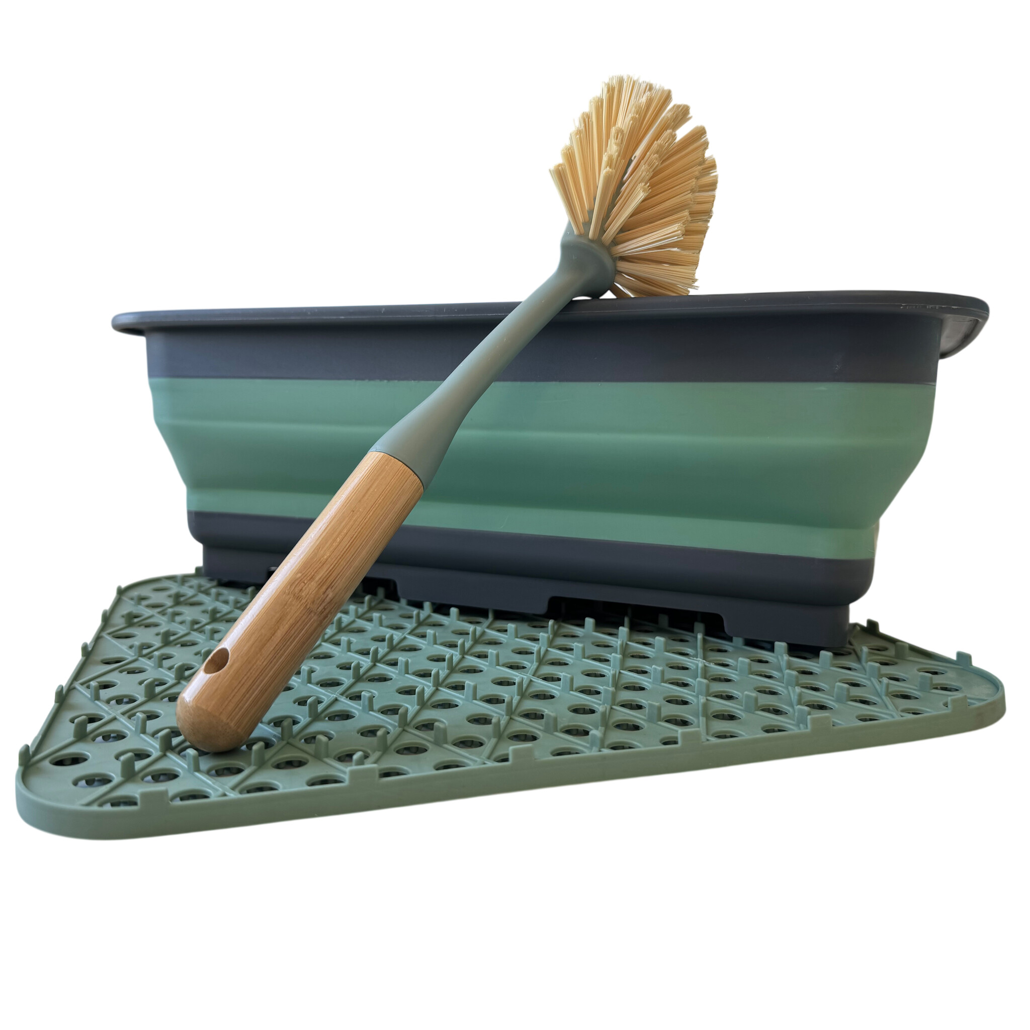 Maak afwassen, afdruipen en spoelen eenvoudiger en efficiënter – thuis én onderweg – met deze complete 3-delige afwasset. De set bestaat uit een opvouwbare afwasbak van 8 liter met handgrepen, een duurzame bamboe afwasborstel en een siliconen afdruipmat van 29,5 x 26 cm. Perfect voor gebruik in de keuken, op de camping, in de caravan, camper of op de boot.