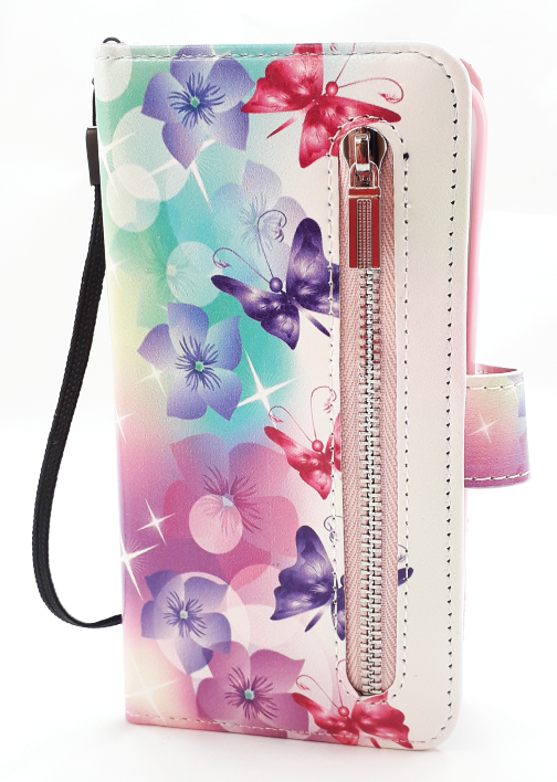 Apple iPhone X/XS boekhoesje wit met vlinders en bloemen Hoesje met pasjesflip en rits voor kleingeld en polsbandje