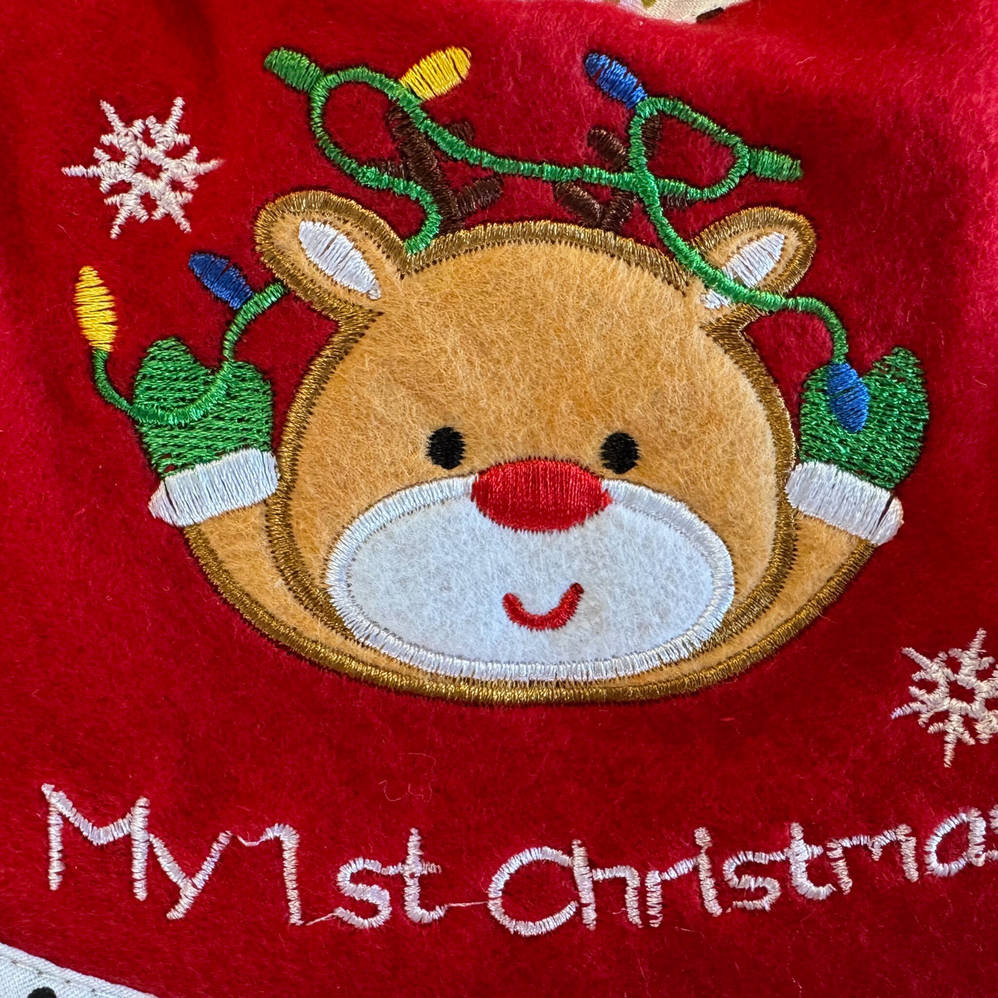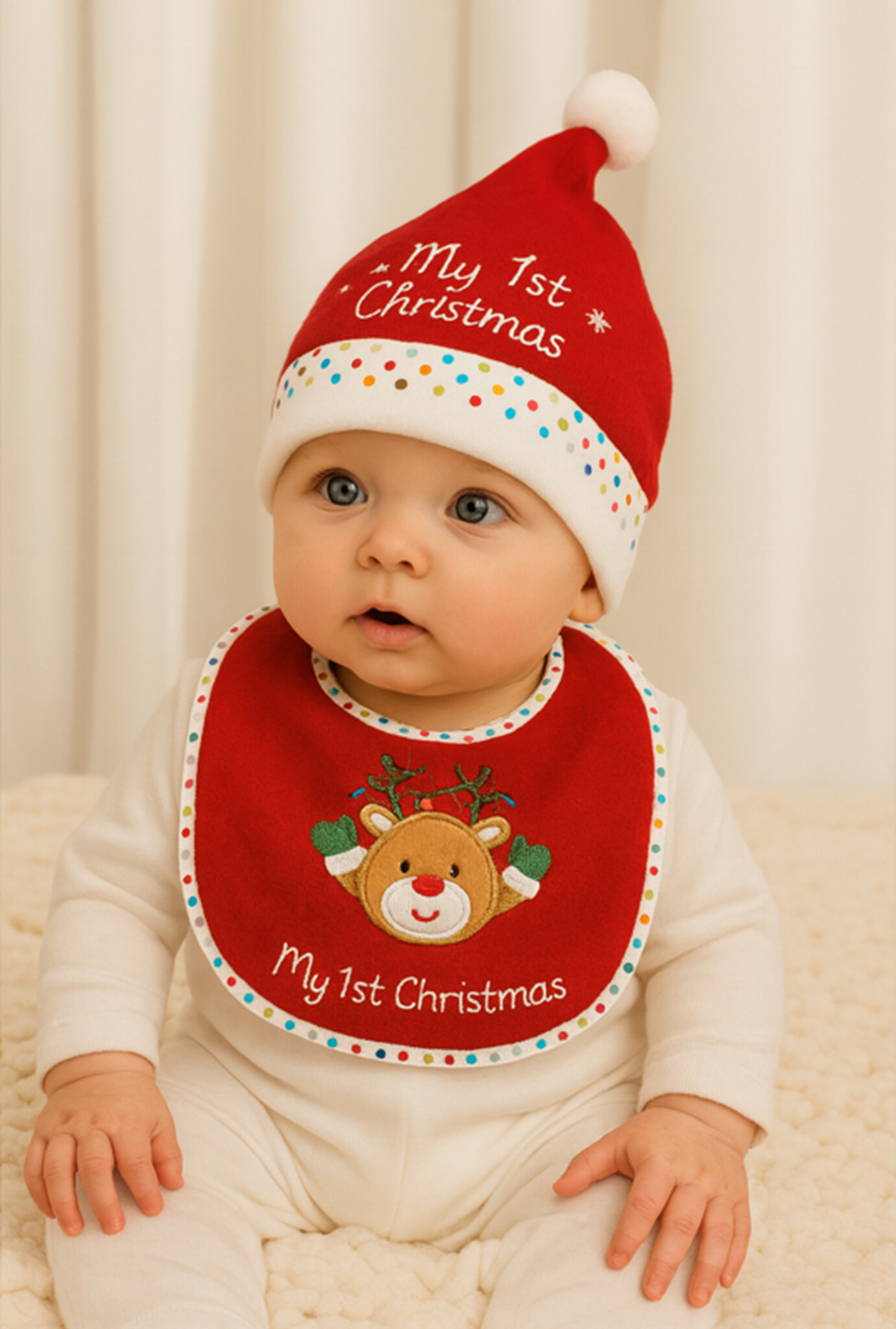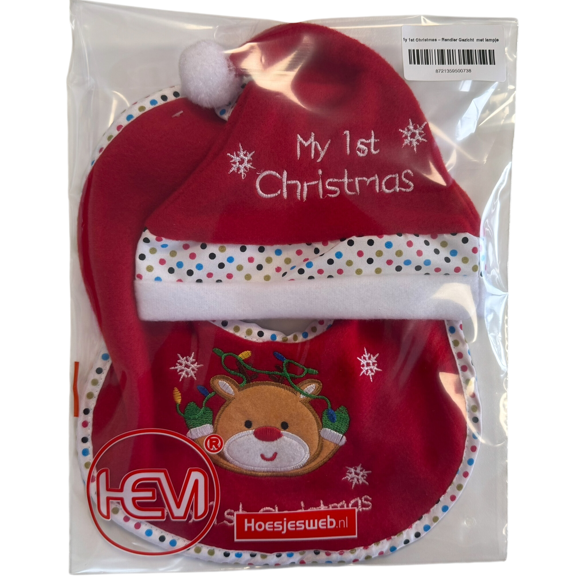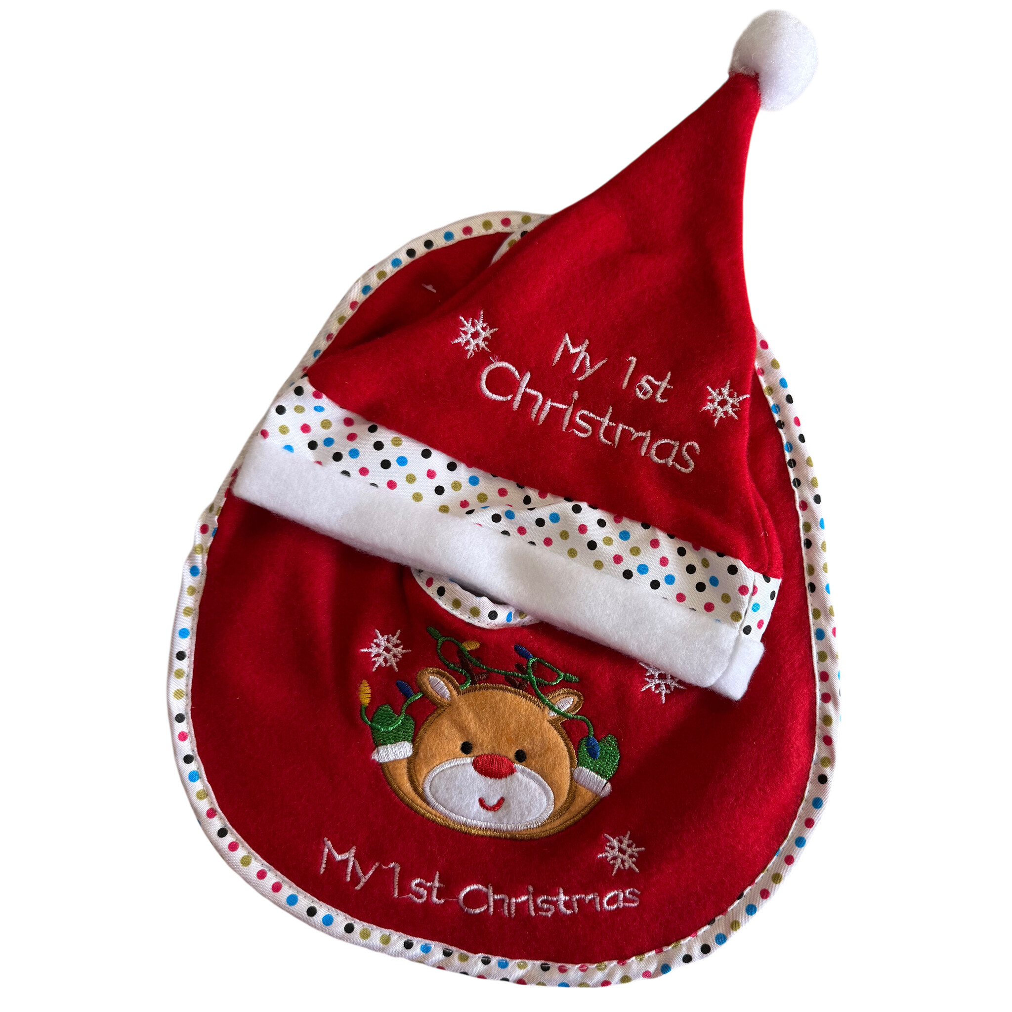 De set bestaat uit een rood-wit slabbetje en een warme kerstmuts met de tekst My 1st Christmas. Verkrijgbaar met vrolijke prints zoals een rendier, rendier met lampjes, teddybeer of pinguïn.