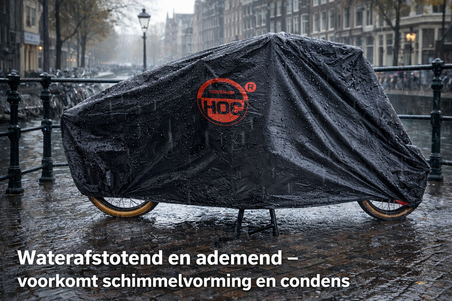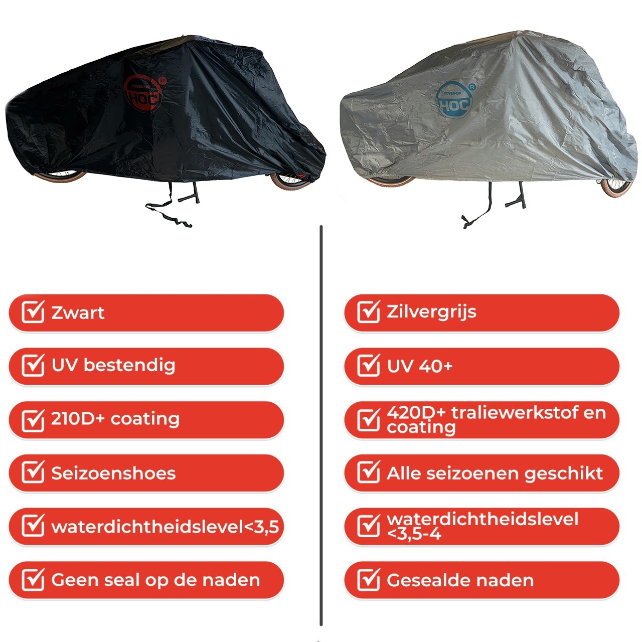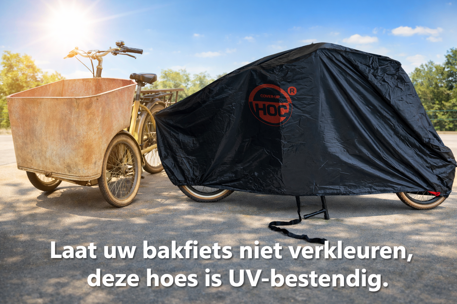 Deze COVER UP HOC Bakfietshoes zwart (met huif) - 3XL - 295x110x140cm - stofvrij / ademend / waterafstotend - Red Label met slotgaten is licht van gewicht en beschermt uw bakfiets tegen regen, stof, UV en vorst. Ook beschikt de hoes over een slotgat om uw bakfiets met een kettingslot te beschermen. Deze bakfietshoes is geschikt voor meerdere modellen zie onderstaand lijstje.