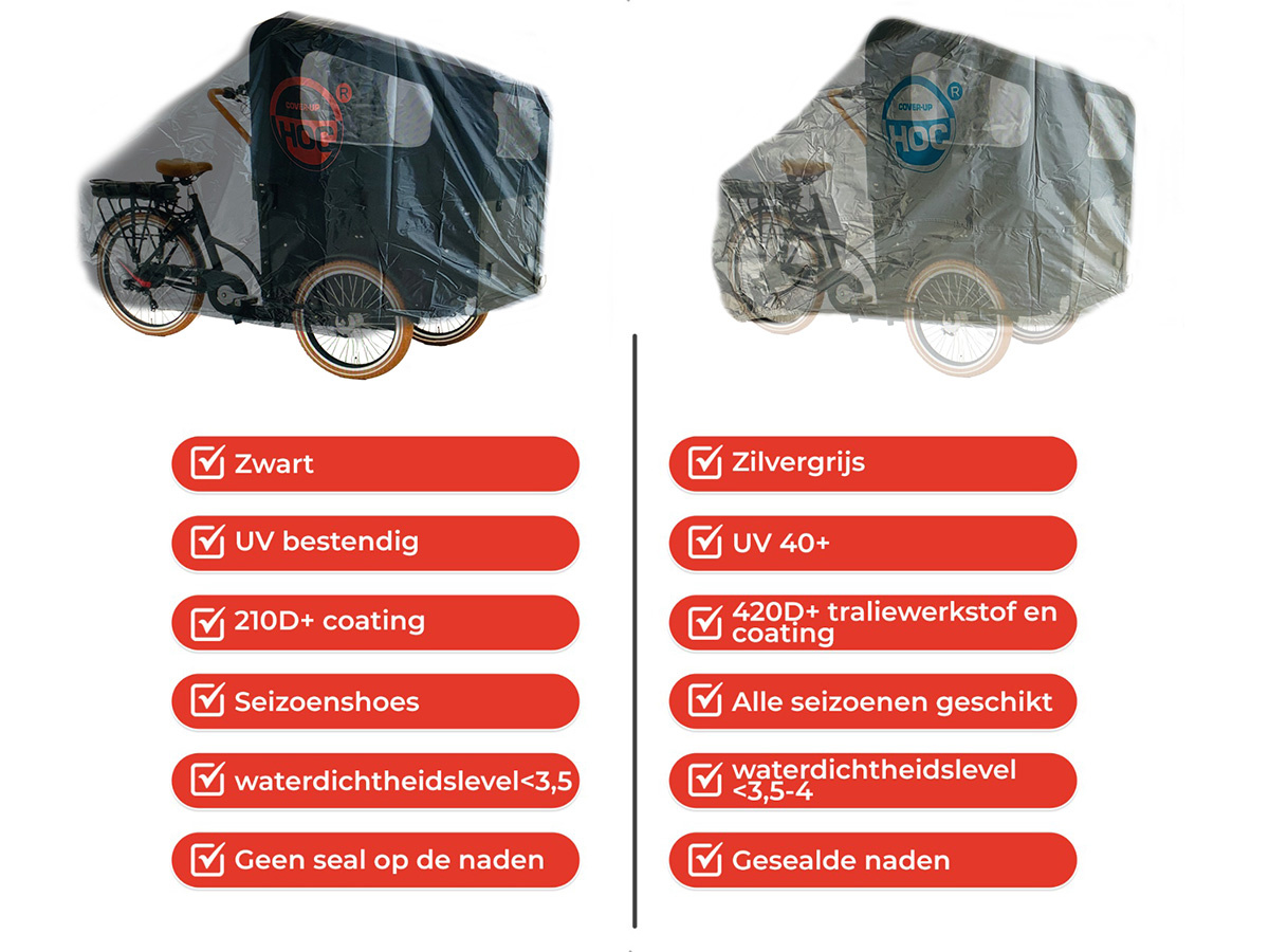 Deze hoes is speciaal vervaardigd voor de Troy bakfiets wat inhoudt dat de stormband wat langer is om goed eronderdoor te halen. Daarnaast is het elastische gedeelte van de hoes afgestemd om netjes over het achterwiel te trekken aan om zo het klapperen van de hoes in de wind tot een minimum te beperken en de fiets optimaal te beschermen. De voorkant van de hoes is wat vierkanter gestikt met elastiek erin verwerkt zodat hij goed om de bak heengetrokken kan worden.