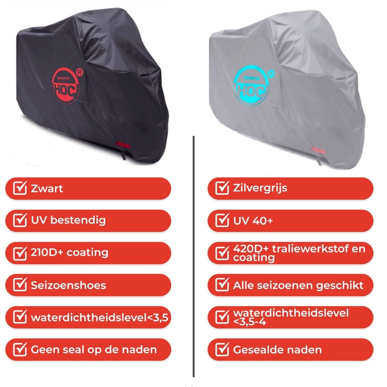 De hoes is gemaakt van sterk 420D materiaal met traliewerk structuur en een waterdichte filmlaag, waardoor hij bestand is tegen zware regen, UV-straling, vorst en vuil. Dankzij de gesealde naden en een waterdichtheid van 3000+ mm blijft je motor optimaal beschermd, zelfs tijdens hevige regenbuien.