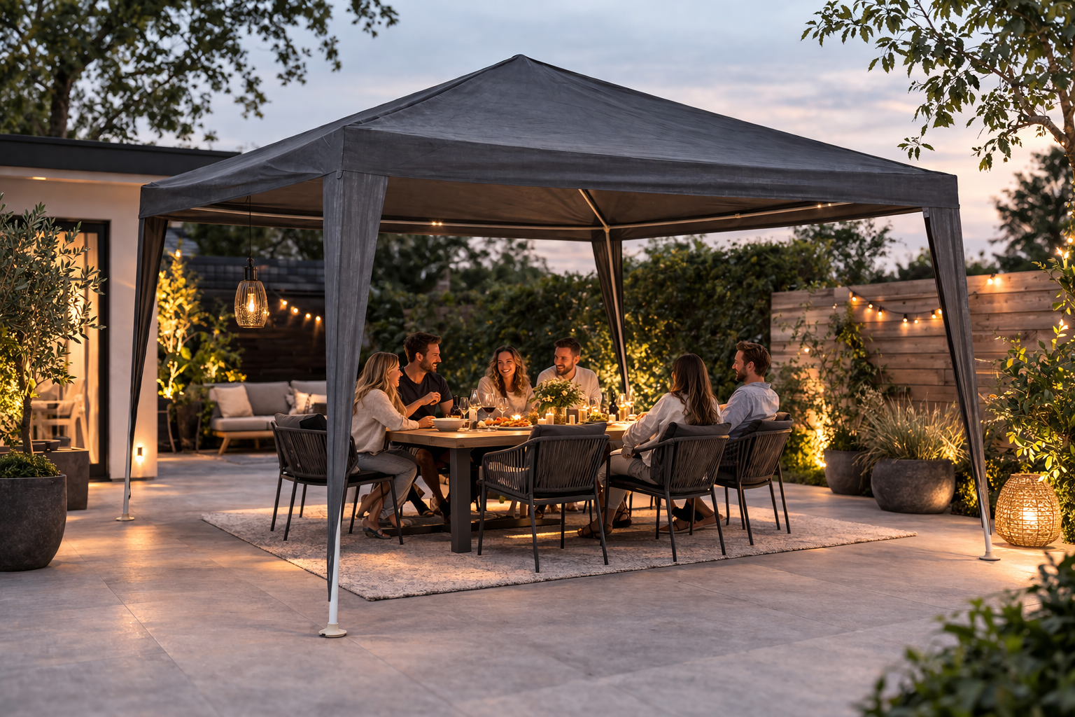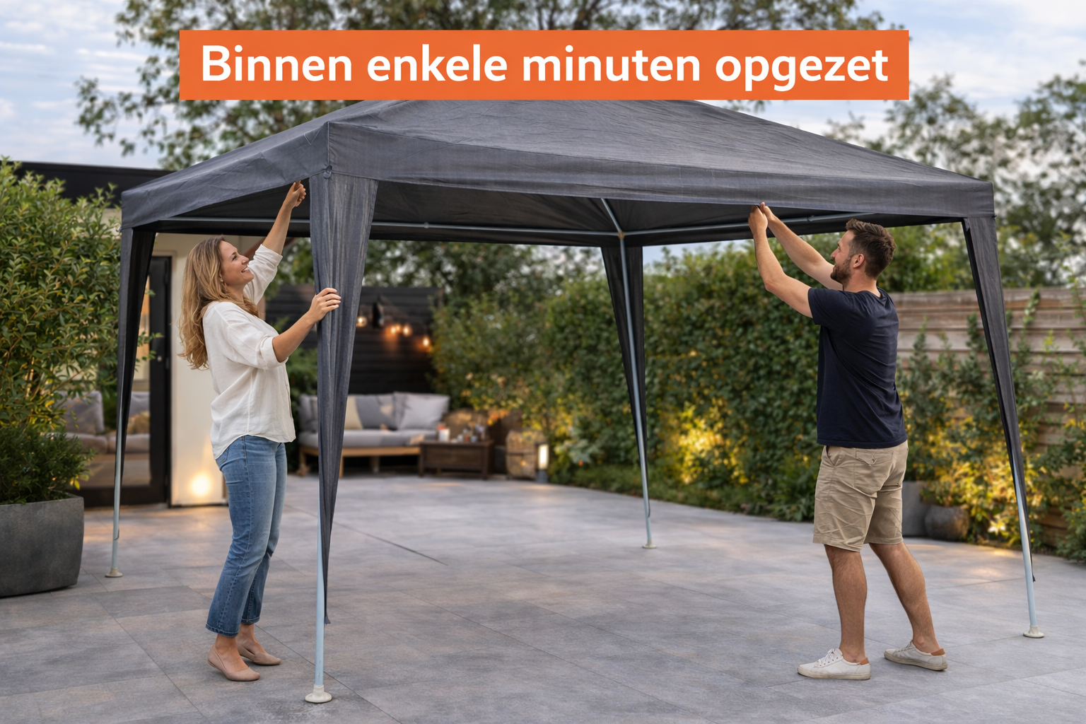 De partytent is eenvoudig op te zetten en weer af te breken, waardoor hij ideaal is voor tijdelijk gebruik bij feestjes, bijeenkomsten of outdoor activiteiten.