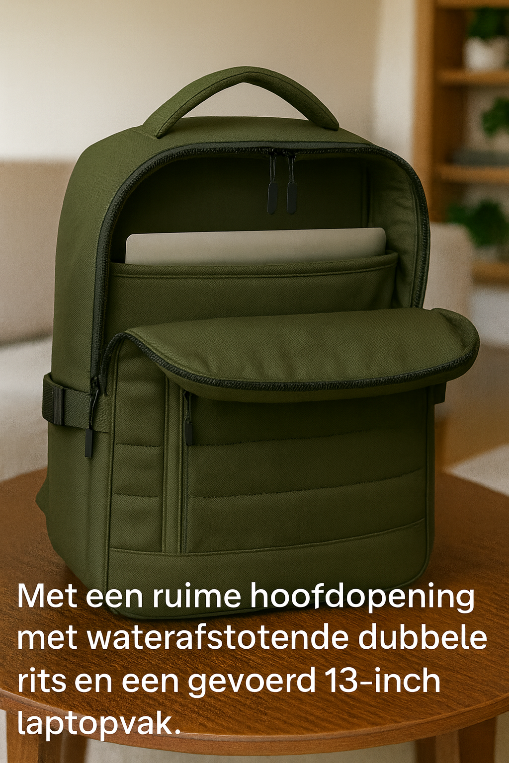 Het hoofdvak opent met een dubbele waterafstotende rits en bevat een gevoerd laptopvak geschikt voor tablets en laptops tot ongeveer 13 inch.