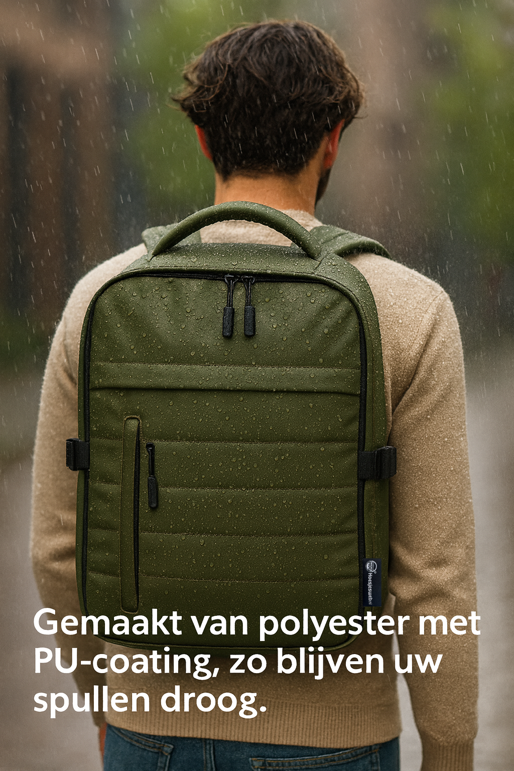 De rugzak is gemaakt van duurzaam high-density polyester met een PU-coating, vergelijkbaar met de stevige, technische stoffen die worden gebruikt bij outdoor- en premium travel gear.