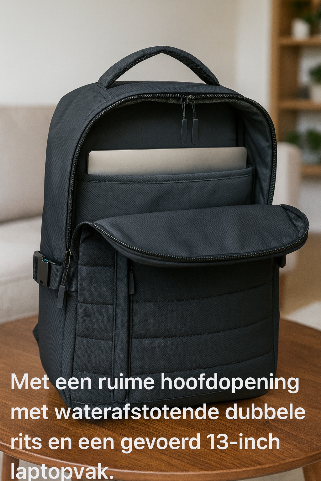 Het hoofdvak opent met een dubbele waterafstotende rits en bevat een gevoerd laptopvak geschikt voor tablets en laptops tot ongeveer 13 inch.
