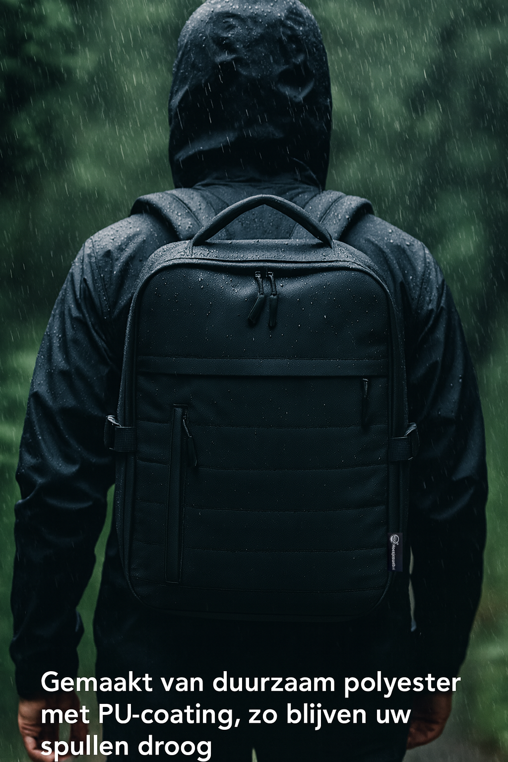 De rugzak is gemaakt van duurzaam high-density polyester met een PU-coating, vergelijkbaar met de stevige, technische stoffen die worden gebruikt bij outdoor- en premium travel gear.