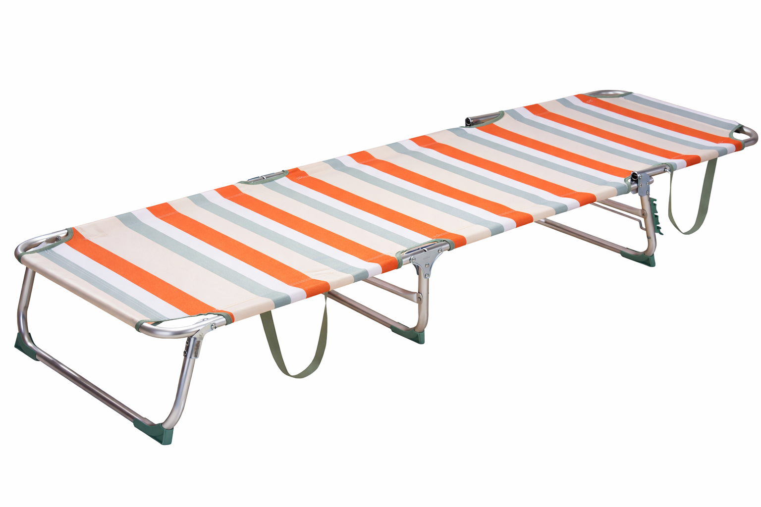 Dankzij het opvouwbare ontwerp is het ligbed eenvoudig te vervoeren en compact op te bergen. Het frisse oranje gestreepte design geeft het bed een zomerse uitstraling, terwijl de kunststof pootdoppen zorgen voor stabiliteit en bescherming van de ondergrond. Met een maximaal draagvermogen van 110 kg.