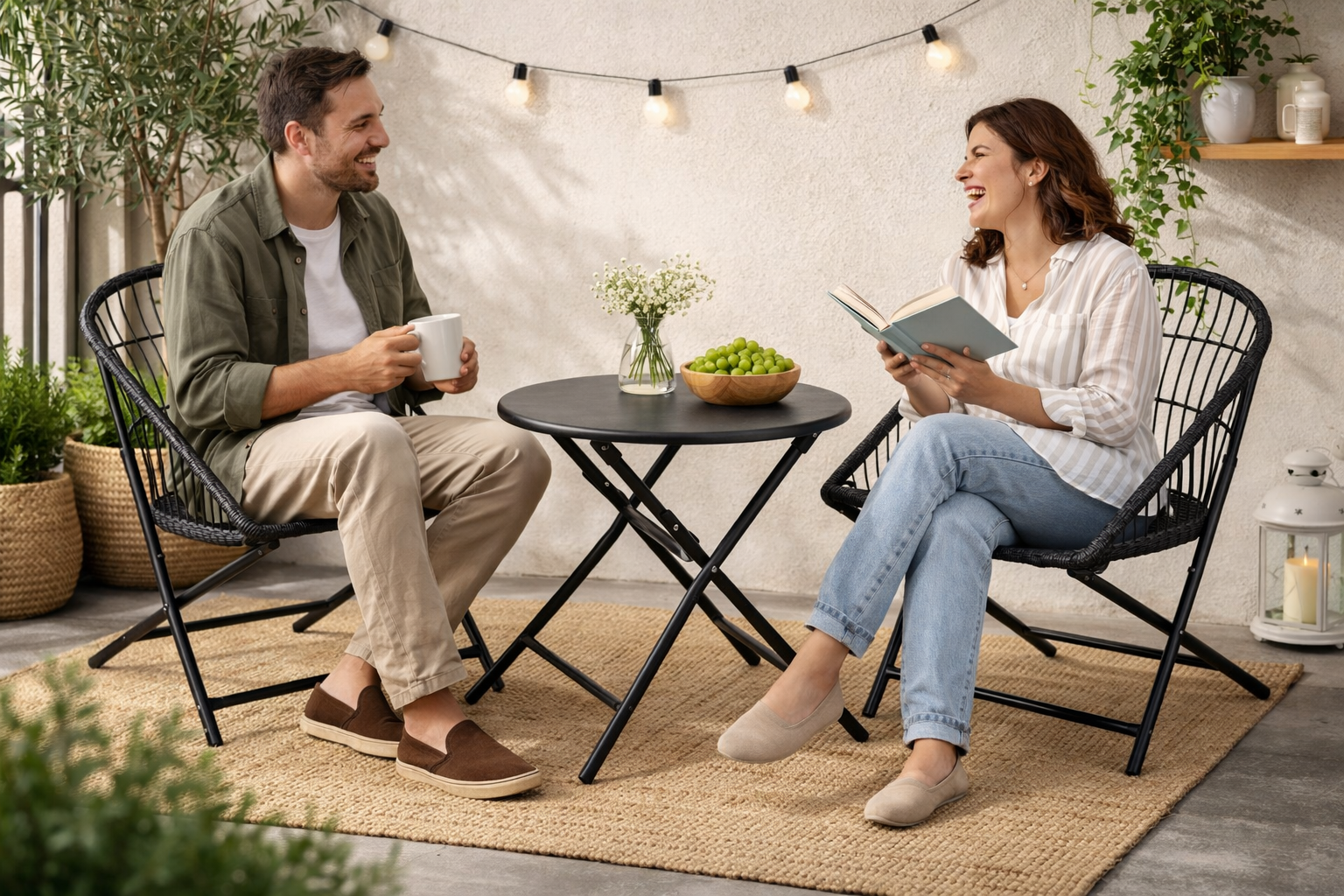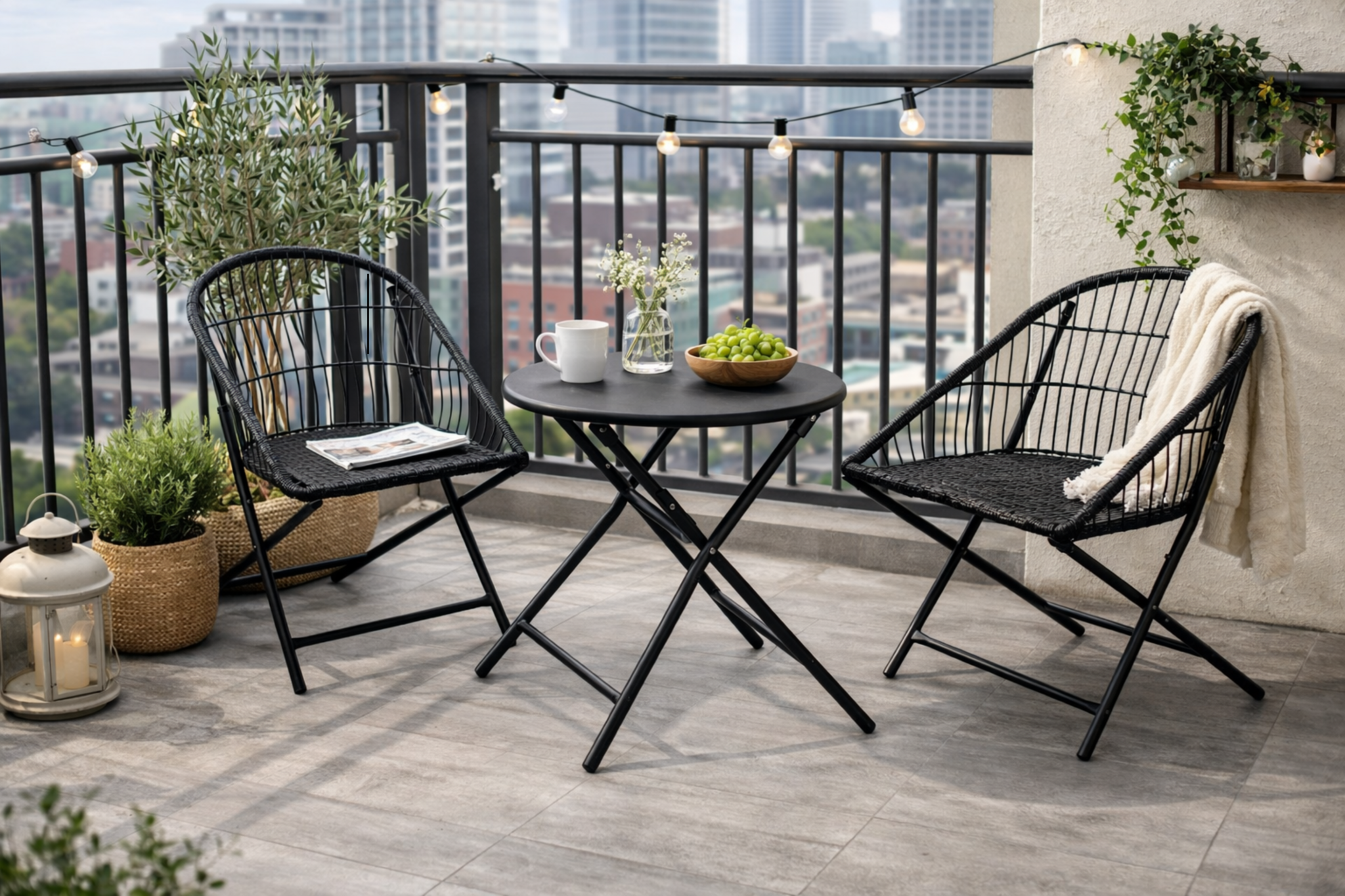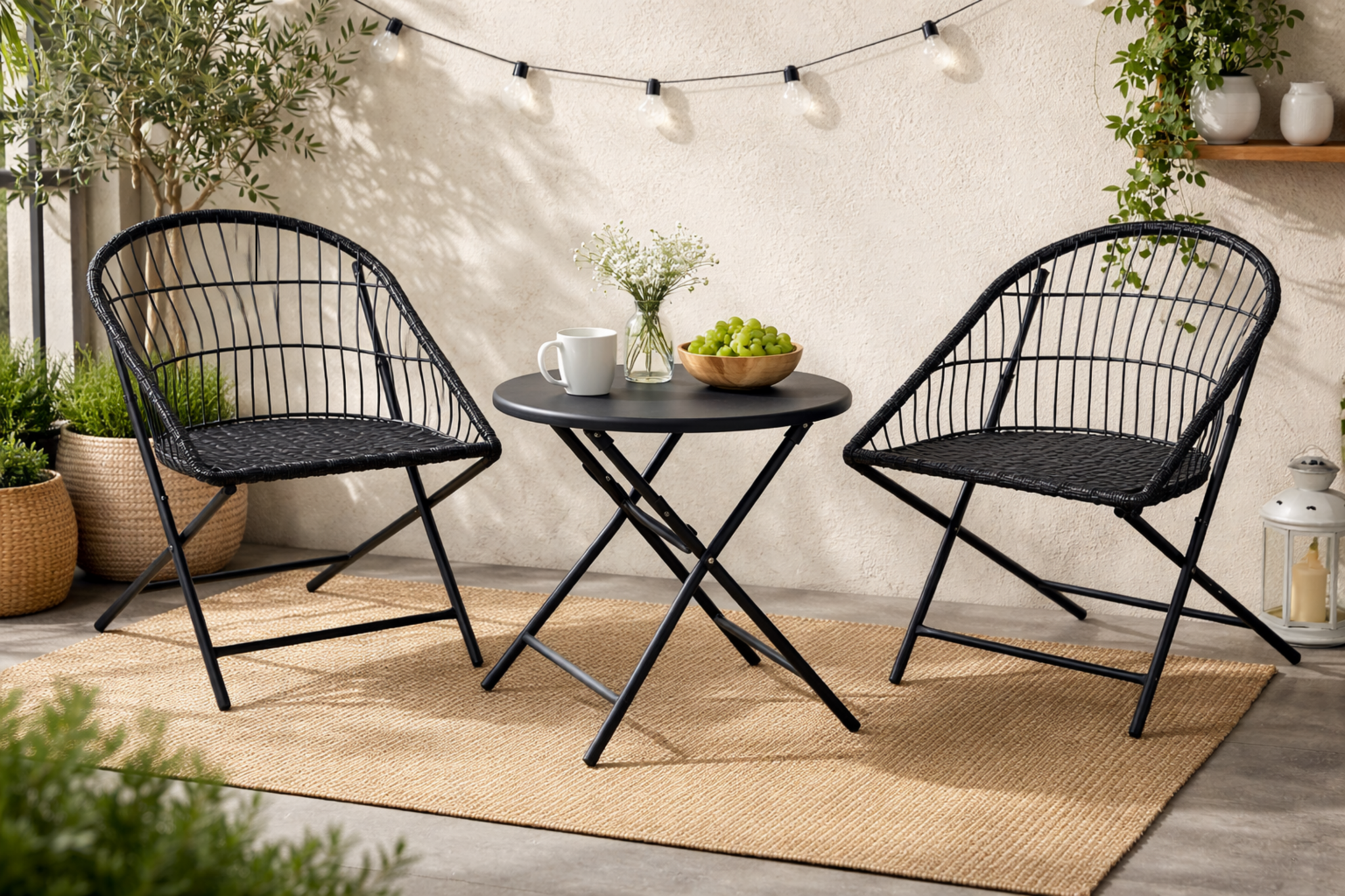 Met deze metalen balkonset creëer je eenvoudig een sfeervolle zitplek voor twee personen.