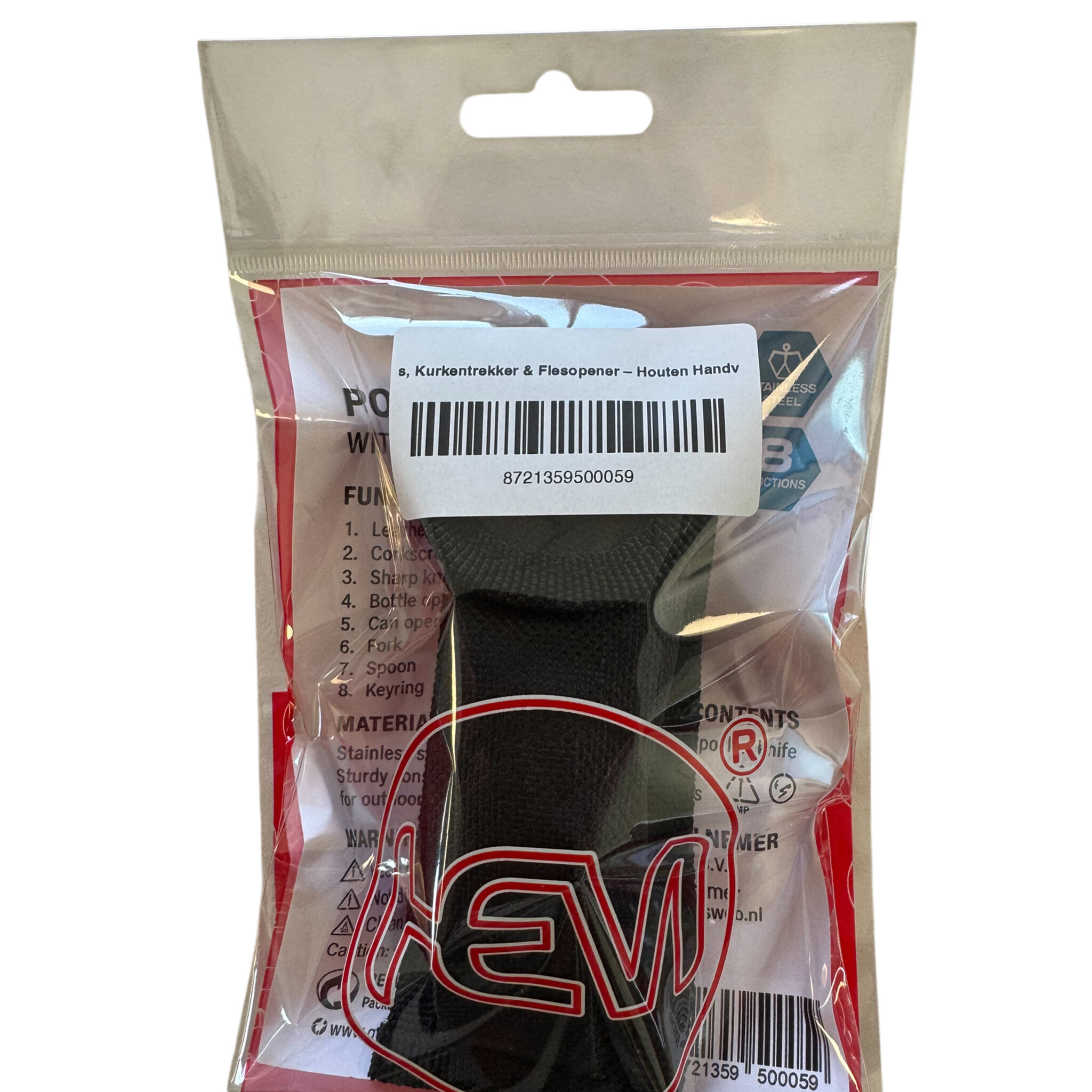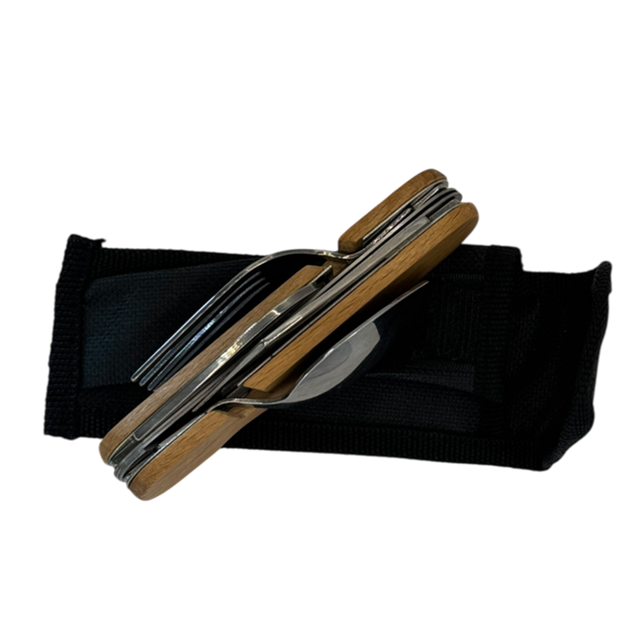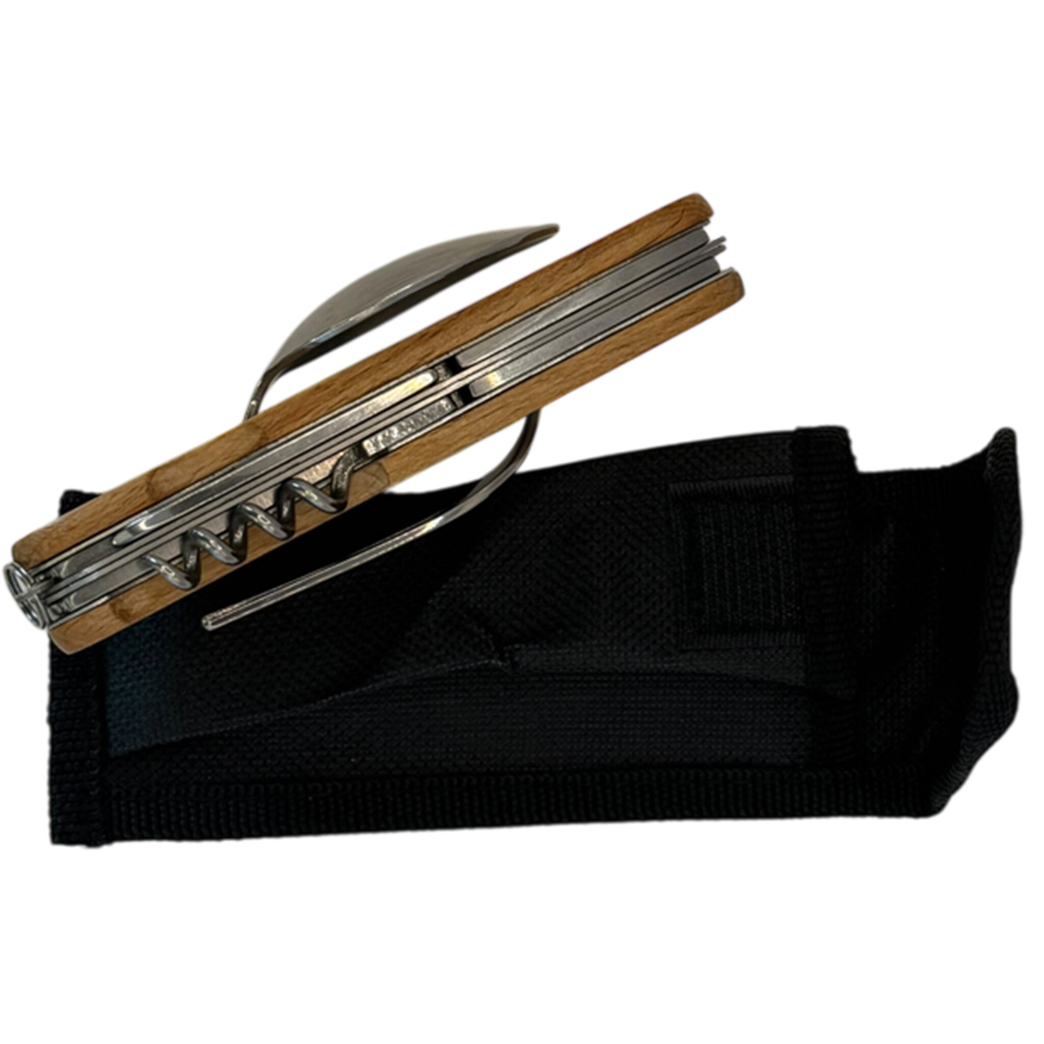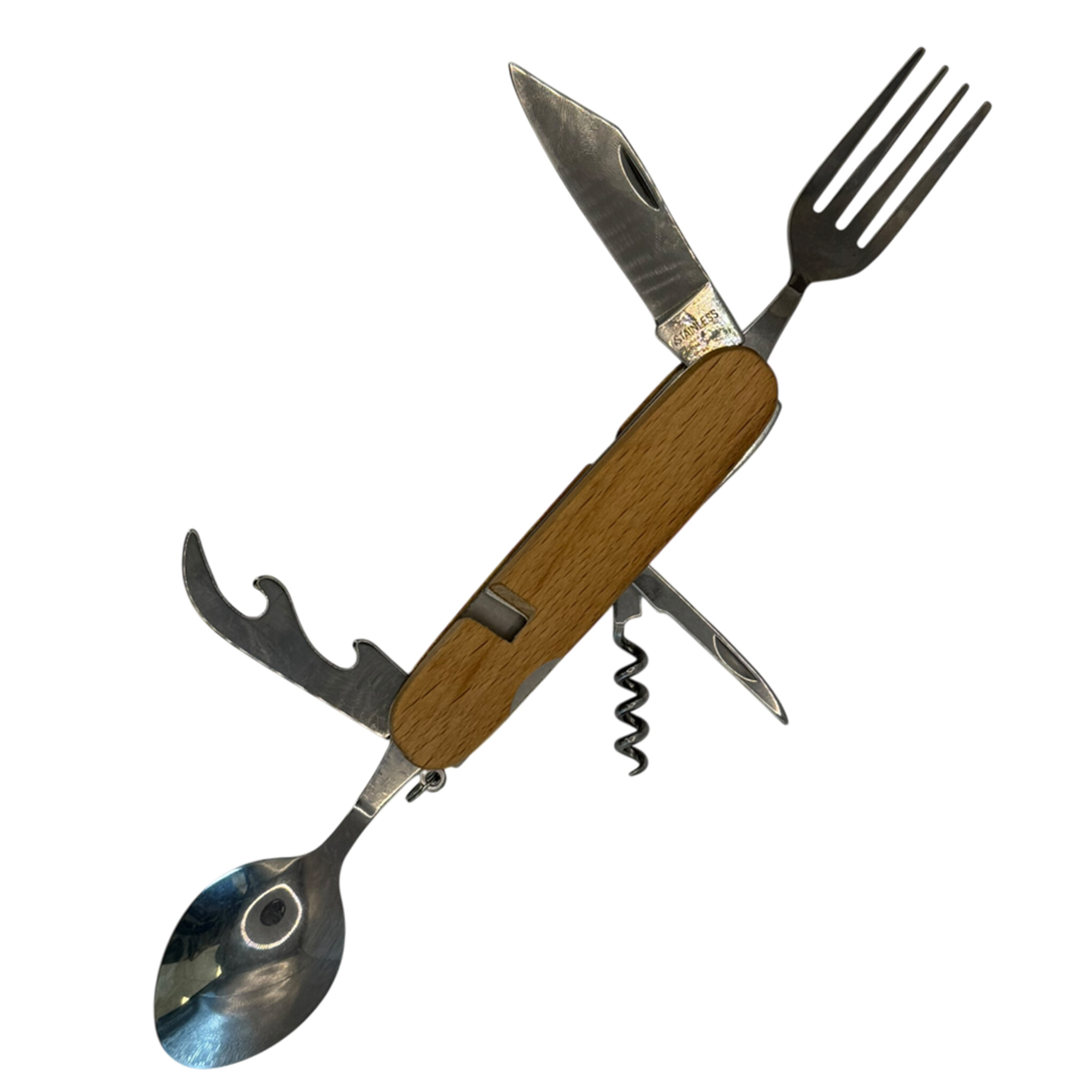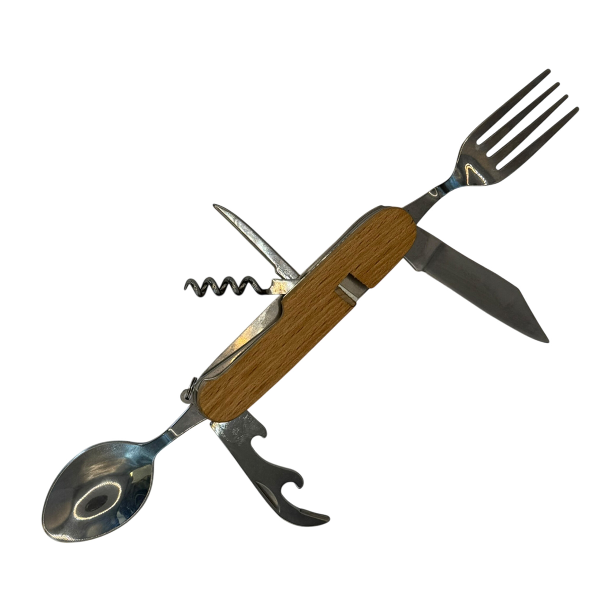 Alles-in-één tool: Inclusief mes, vork, lepel, kurkentrekker, flesopener, blikopener en priem