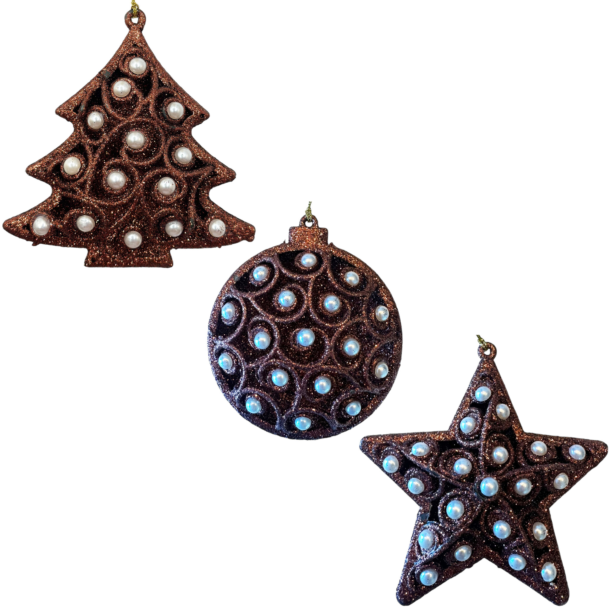 Deze kersthangers stralen elegantie en stijl uit met hun combinatie van glitters en parels. De glitters verspreiden een magisch, schitterend licht wanneer het licht erop valt, terwijl de parels een subtiele, chique touch toevoegen.