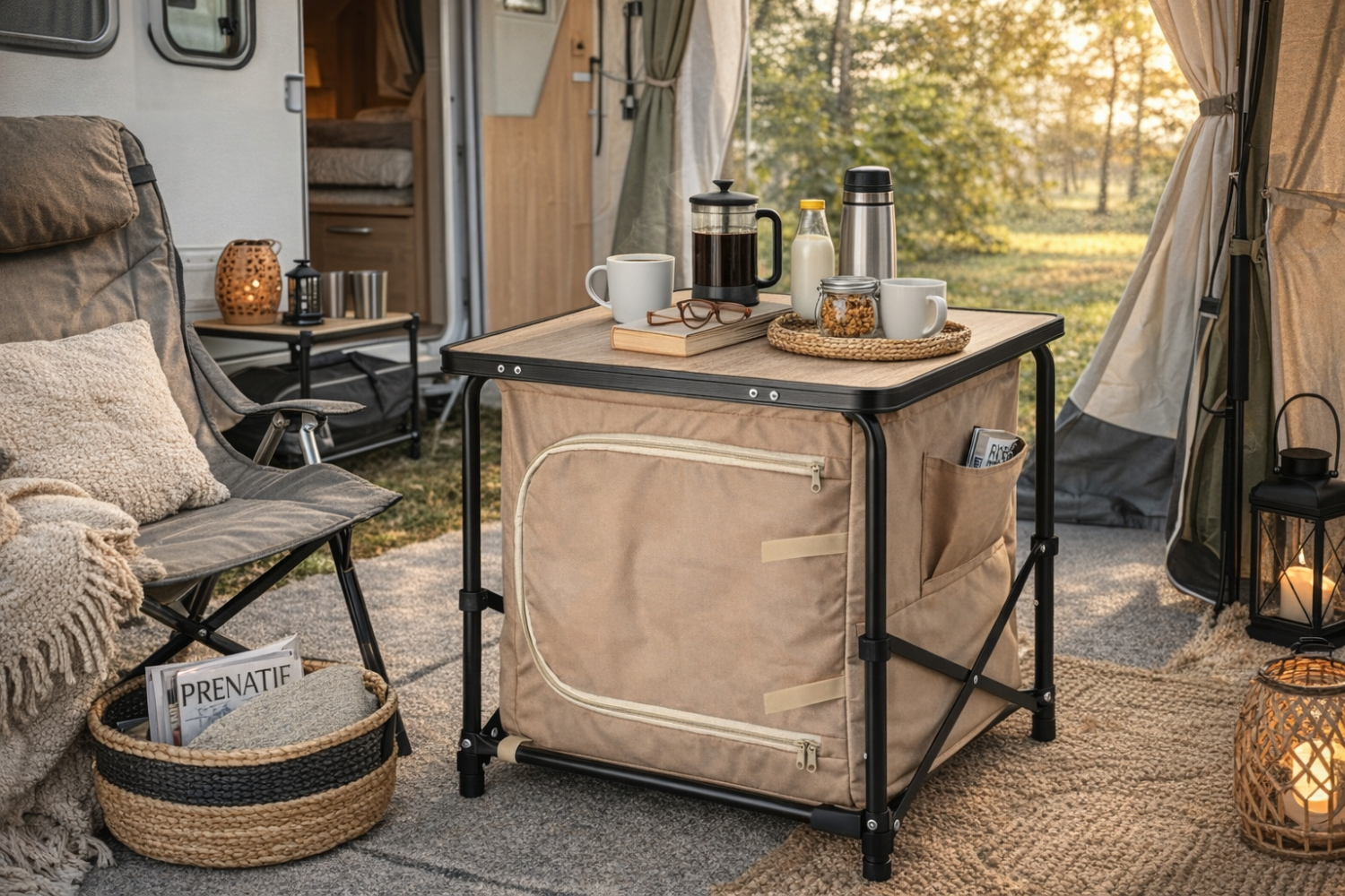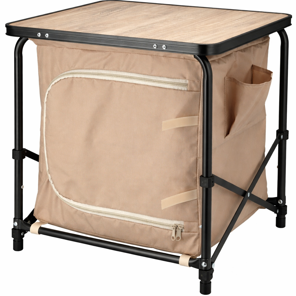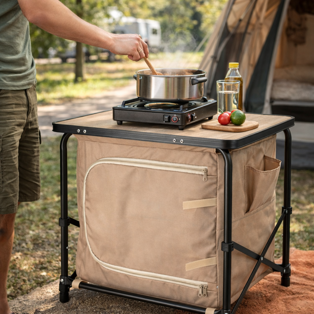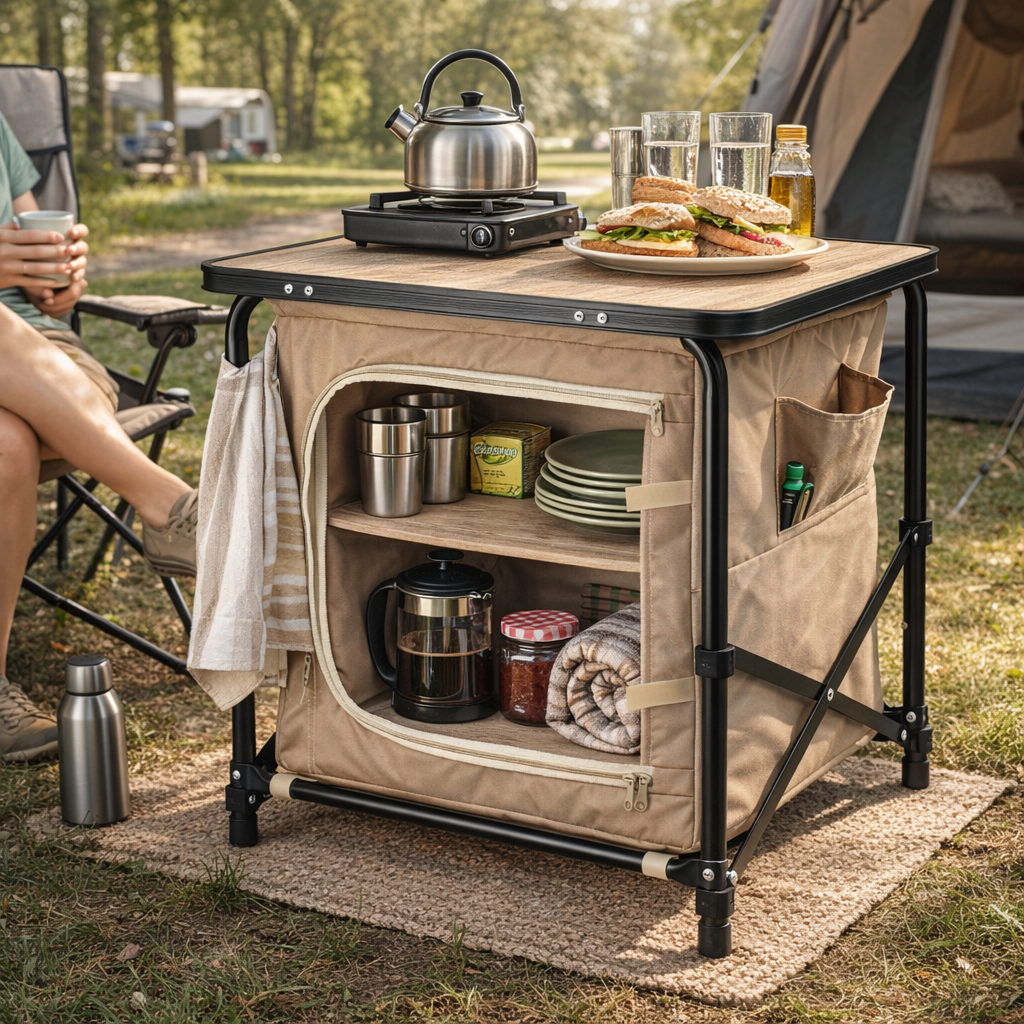 - Inklapbare campingtafel met geïntegreerde opbergkast