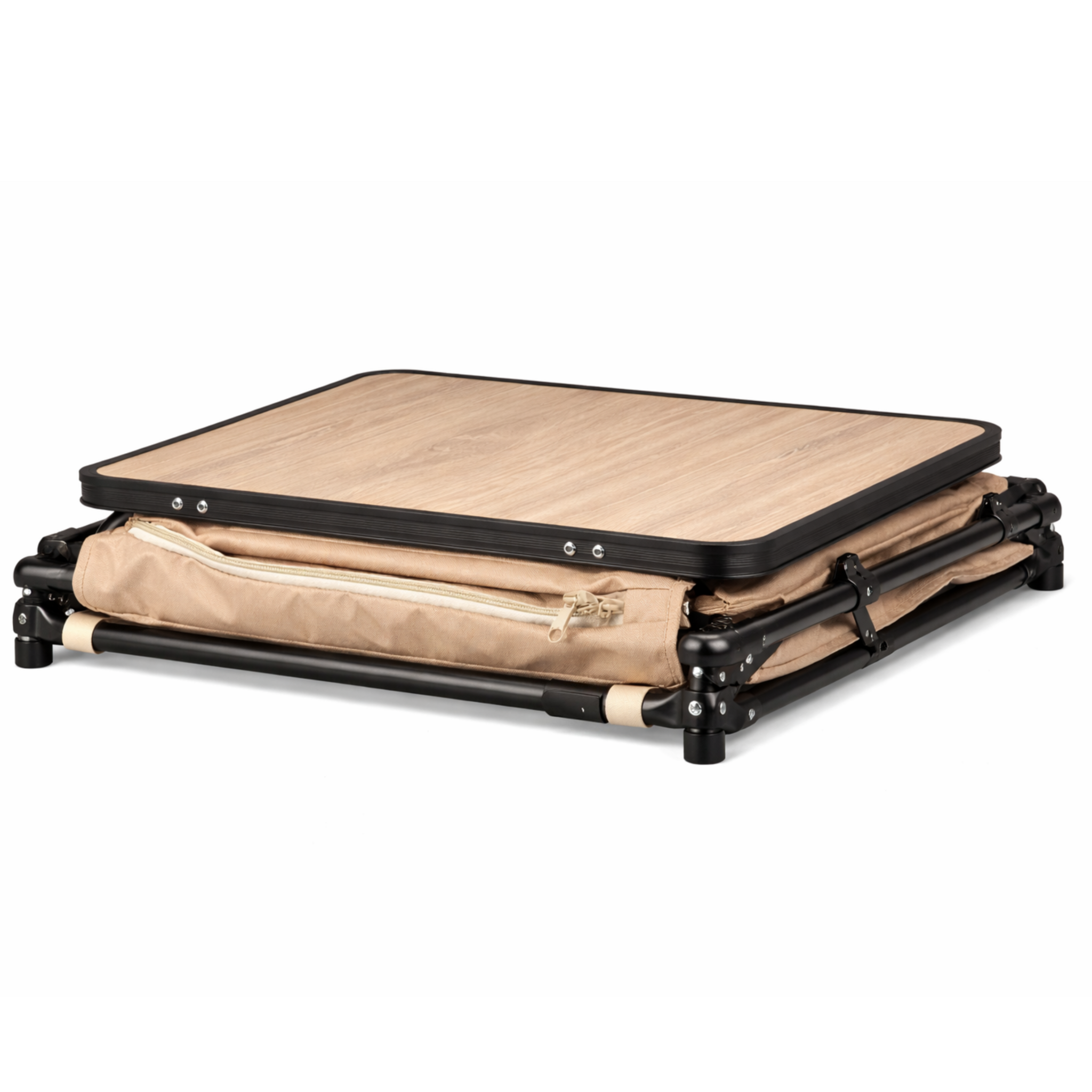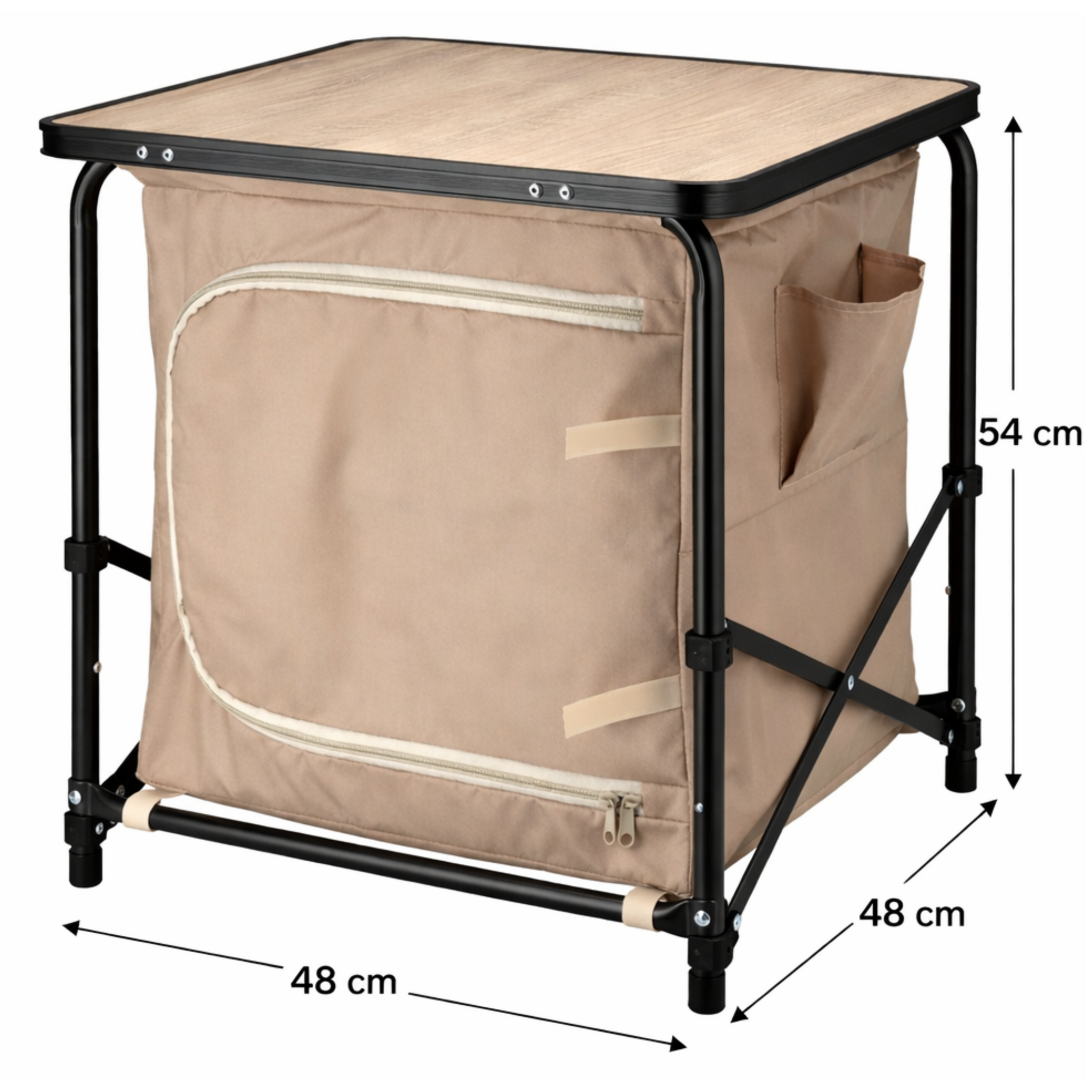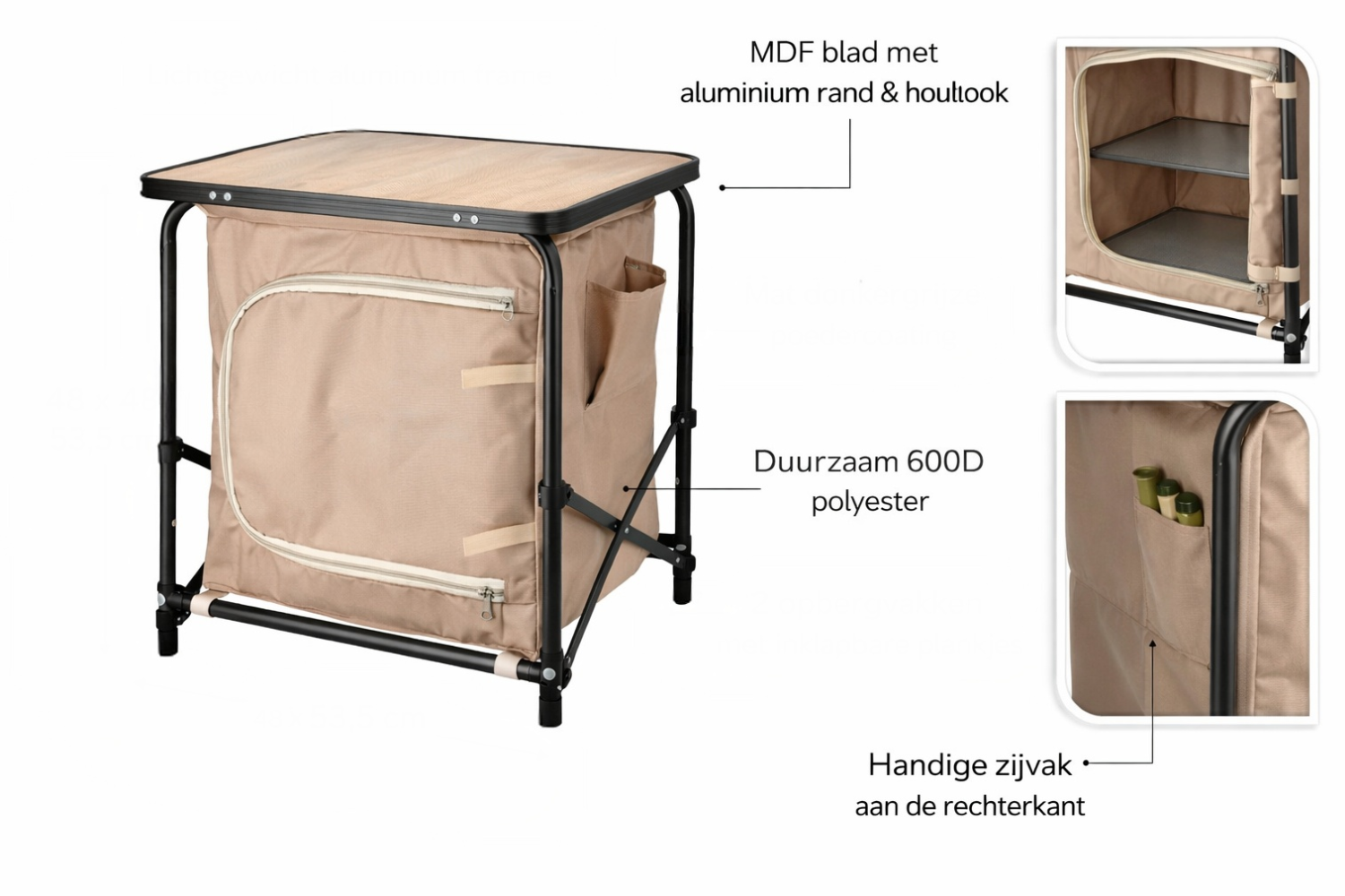 De constructie bestaat uit aluminium buizen met een matte donkergrijze poedercoating, wat zorgt voor een stabiele maar lichtgewicht basis. Het MDF tafelblad met aluminium rand en houtlook afwerking biedt een praktisch oppervlak voor dagelijks gebruik. De opbergkast is gemaakt van duurzaam 600D polyester en beschikt over twee opbergvakken, zodat spullen overzichtelijk en stofvrij kunnen worden opgeborgen.