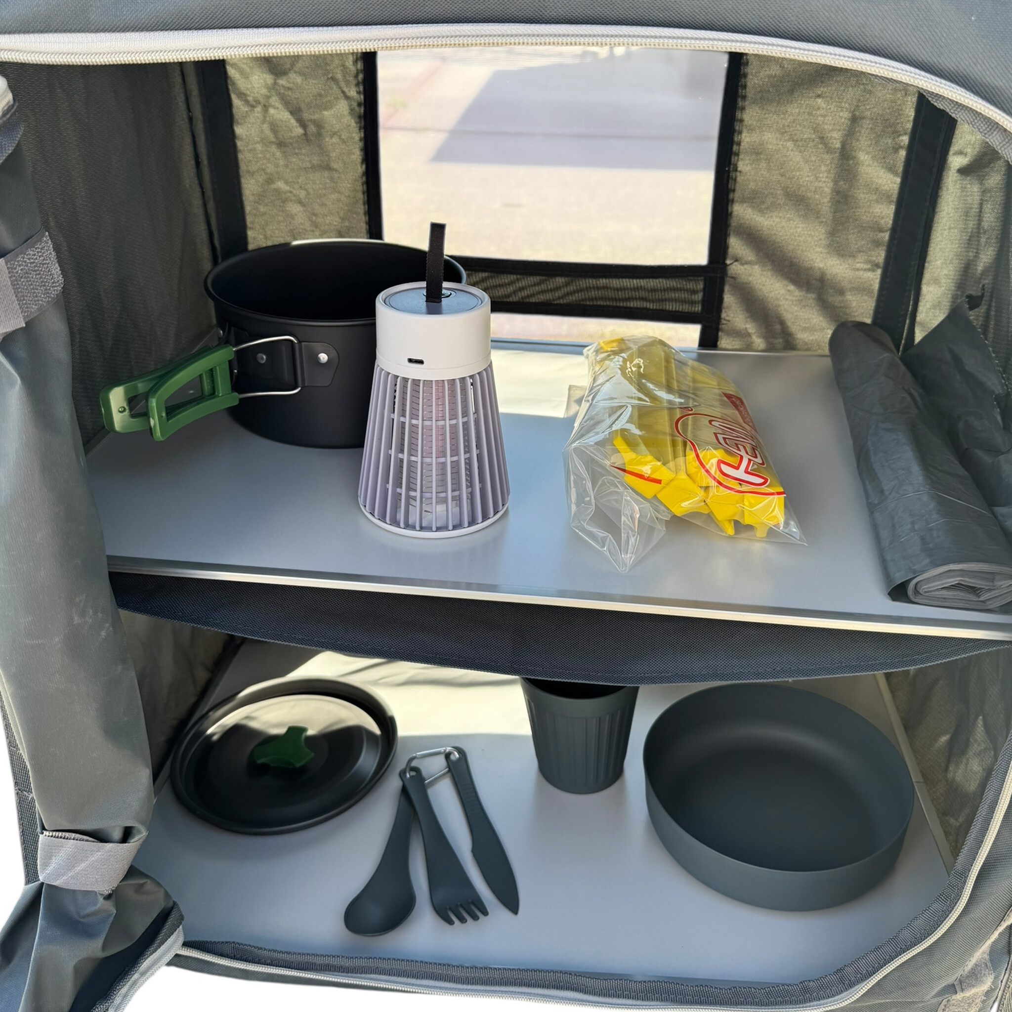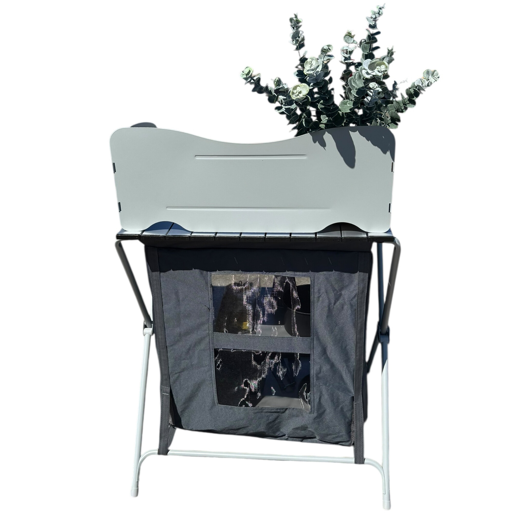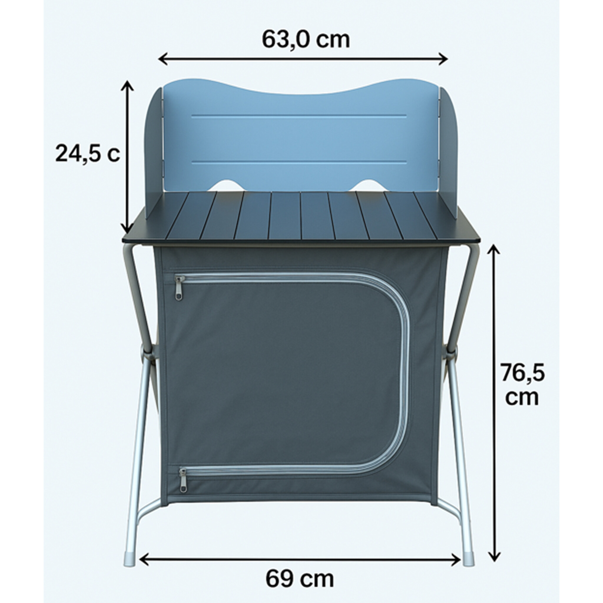 De campingkast is volledig opvouwbaar, voorzien van ruime opbergvakken en wordt geleverd met een stevige draagtas. Ideaal om mee te nemen op vakantie of onderweg.