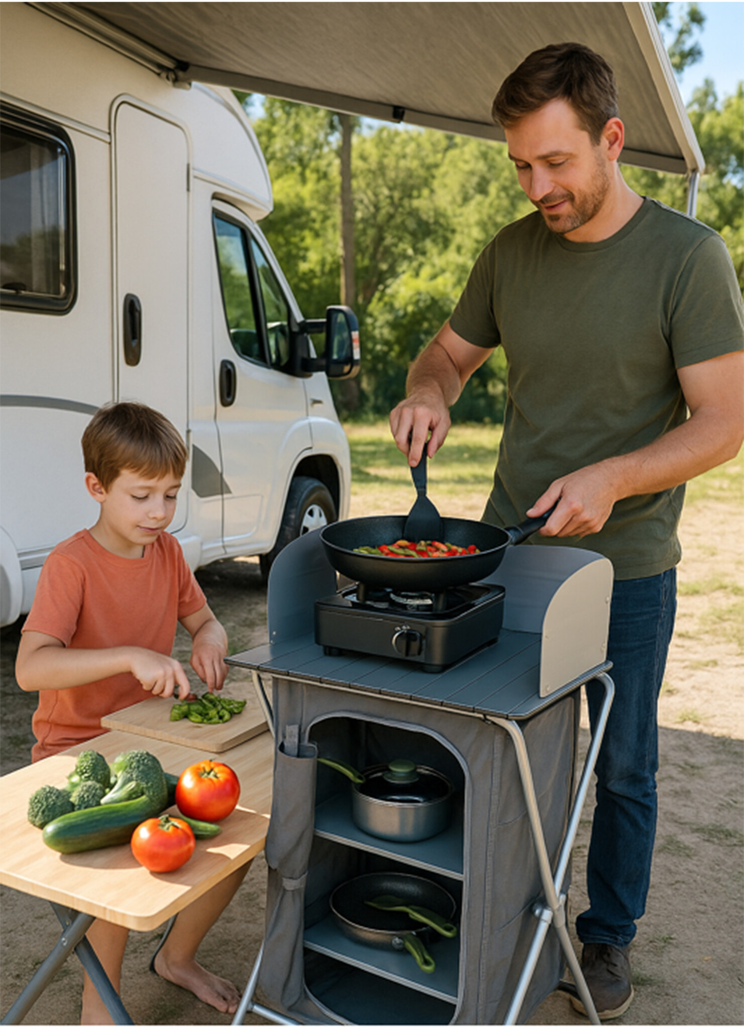 Ervaar het gemak van koken in de buitenlucht met deze praktische HEM campingkeuken. Dankzij het hittebestendige werkblad, het windscherm en de slimme indeling is deze reiskeuken perfect voor kampeerders die comfort en functionaliteit willen combineren. Gebruik hem als buitenkeuken bij je caravan, voortent of tijdens een festival.