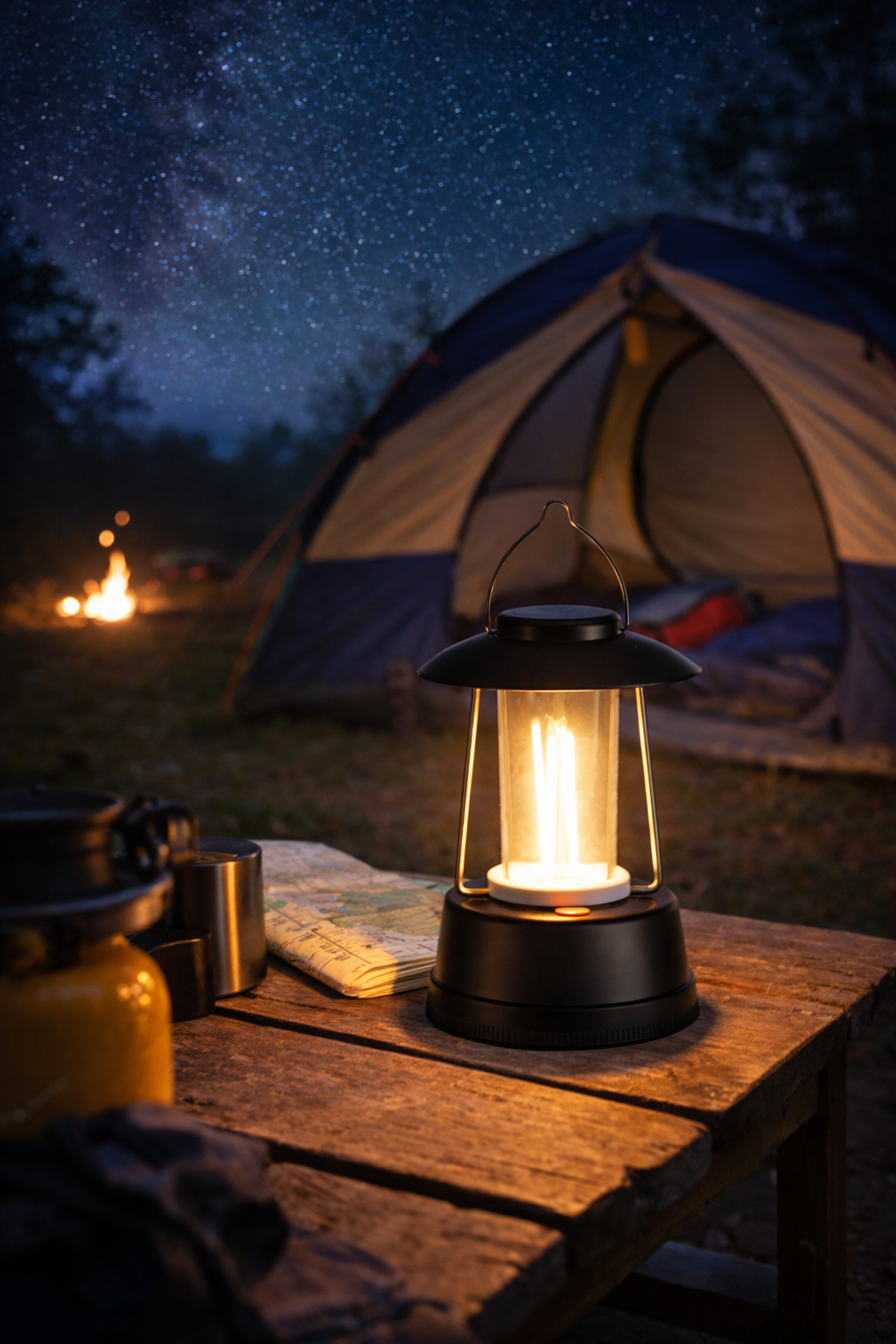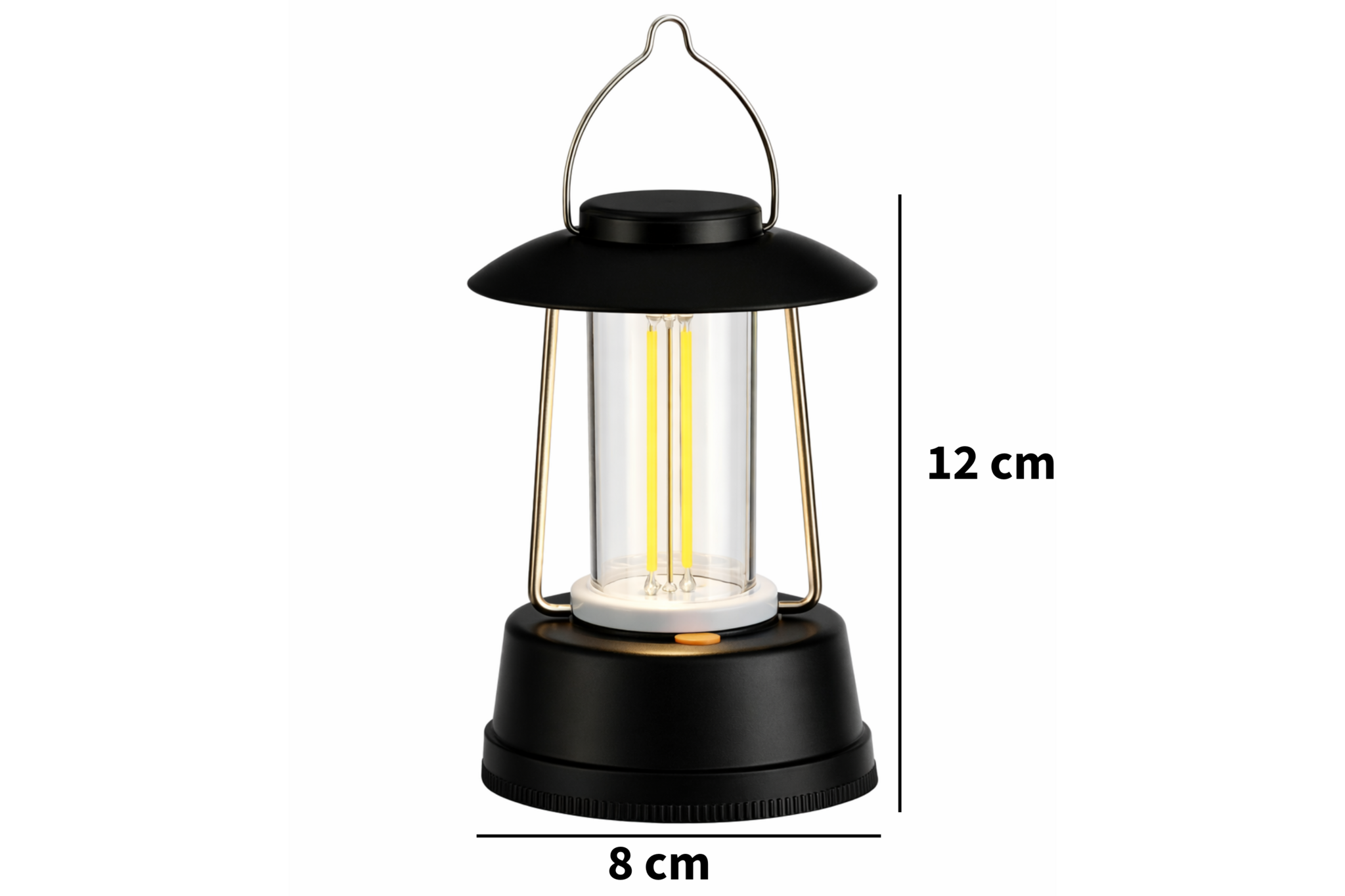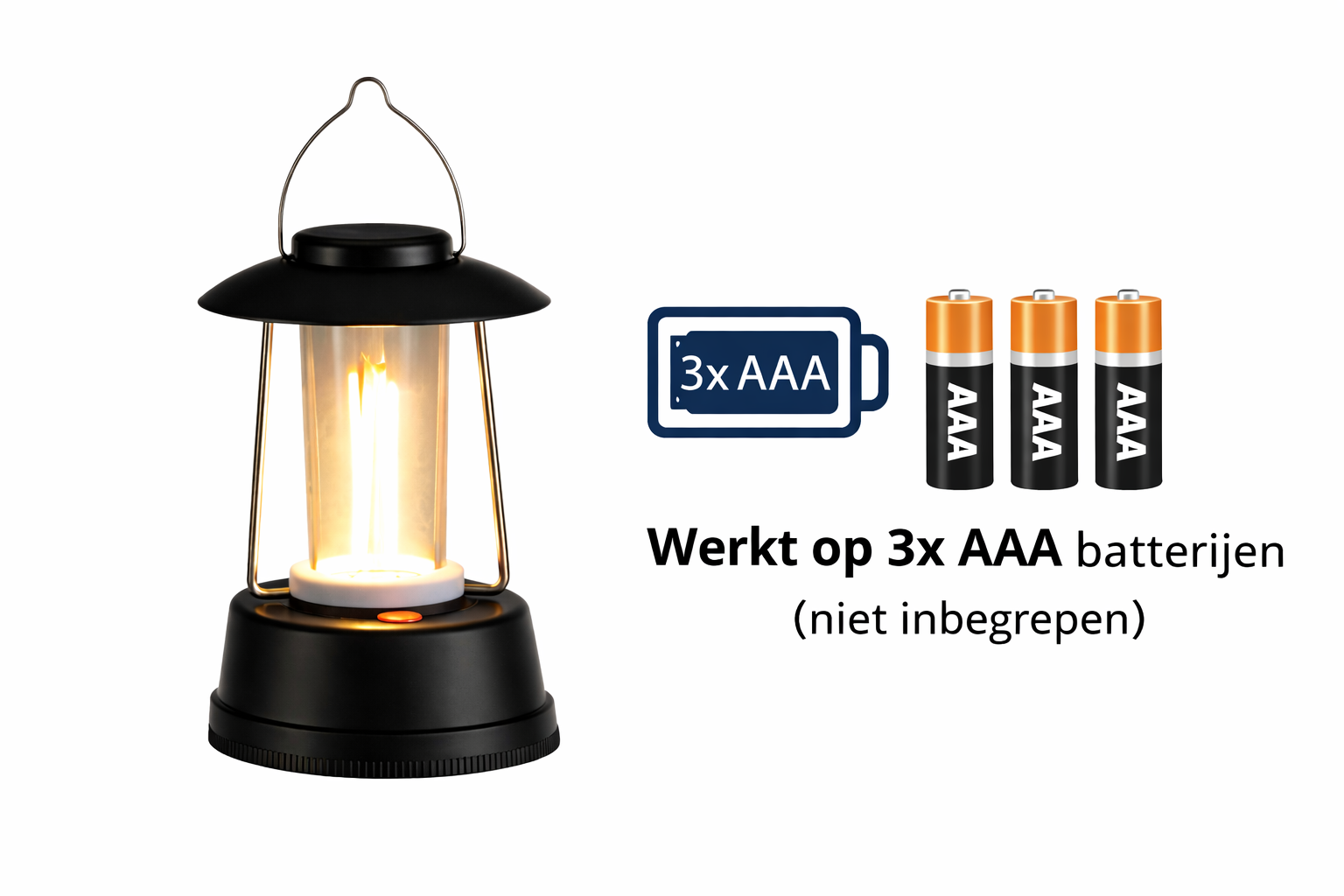 De campinglamp werkt op 3 AAA-batterijen (niet inbegrepen).