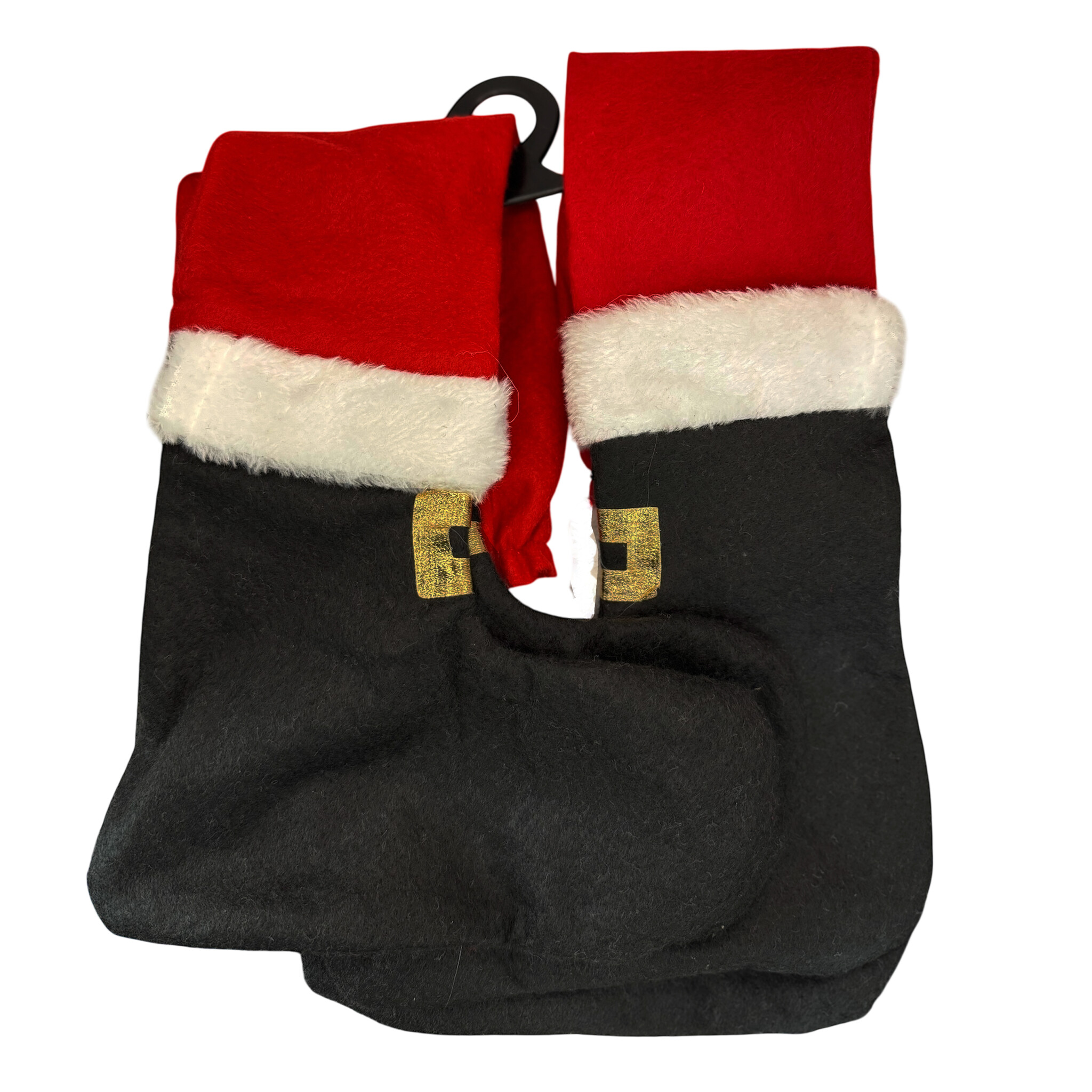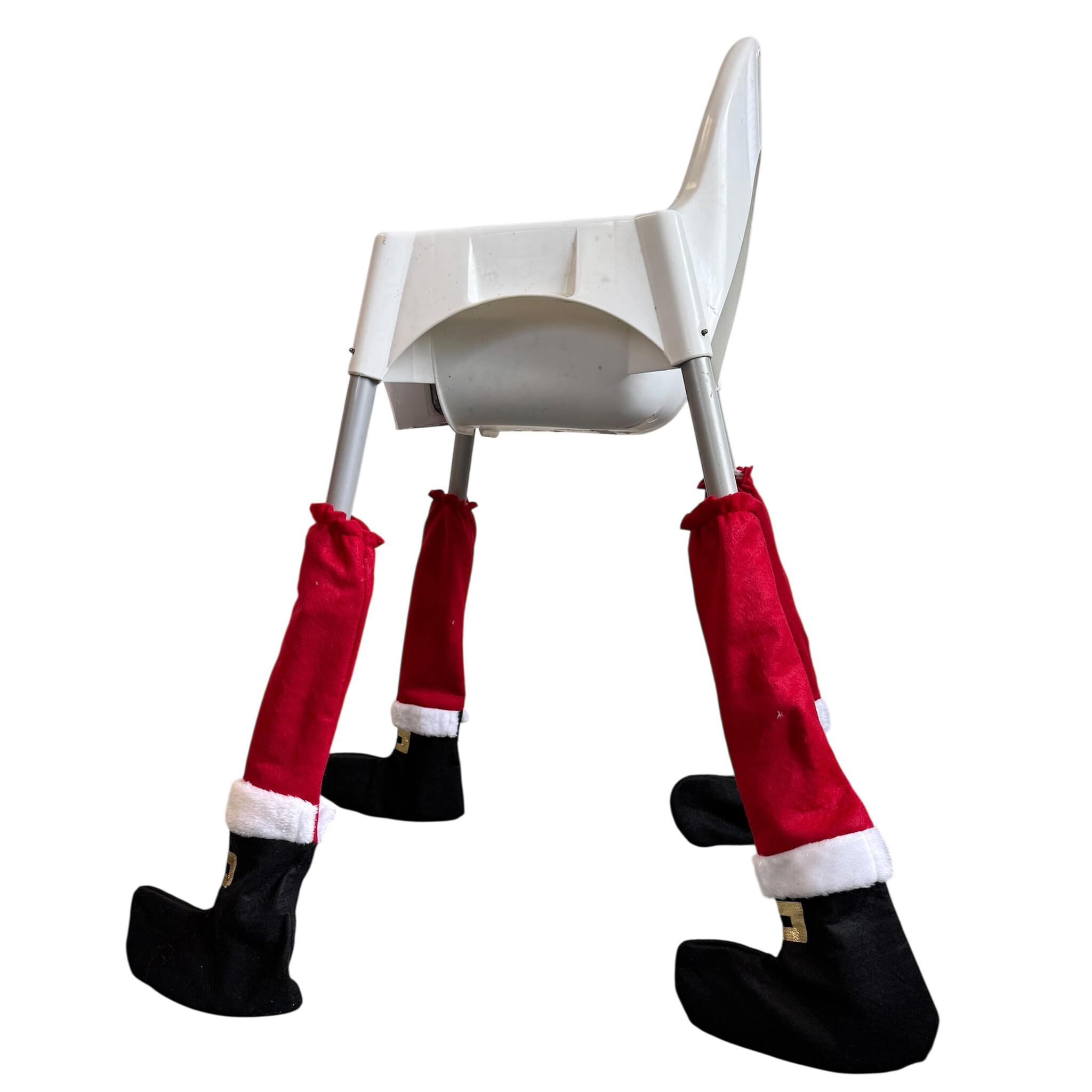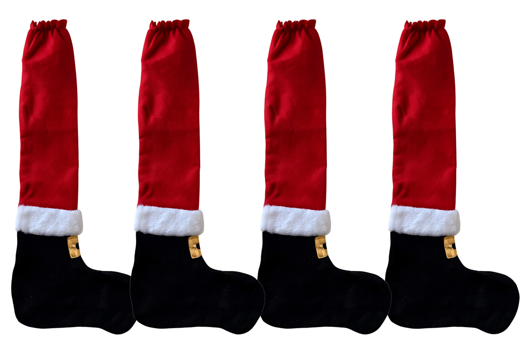 Breng kerstsfeer in huis met deze vrolijke Santa tafelpoot hoezen. De set van 4 hoezen in rood met zwarte laarzen en gouden gespen past om bijna alle tafelpoten. Herbruikbaar, eenvoudig te plaatsen en dé kerstdecoratie voor elk diner of feestje.