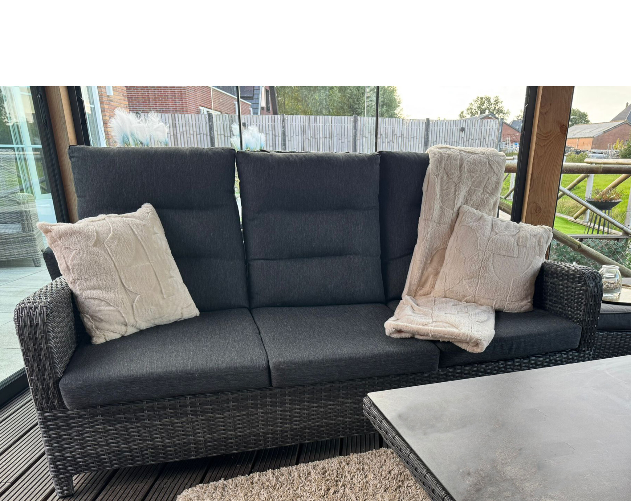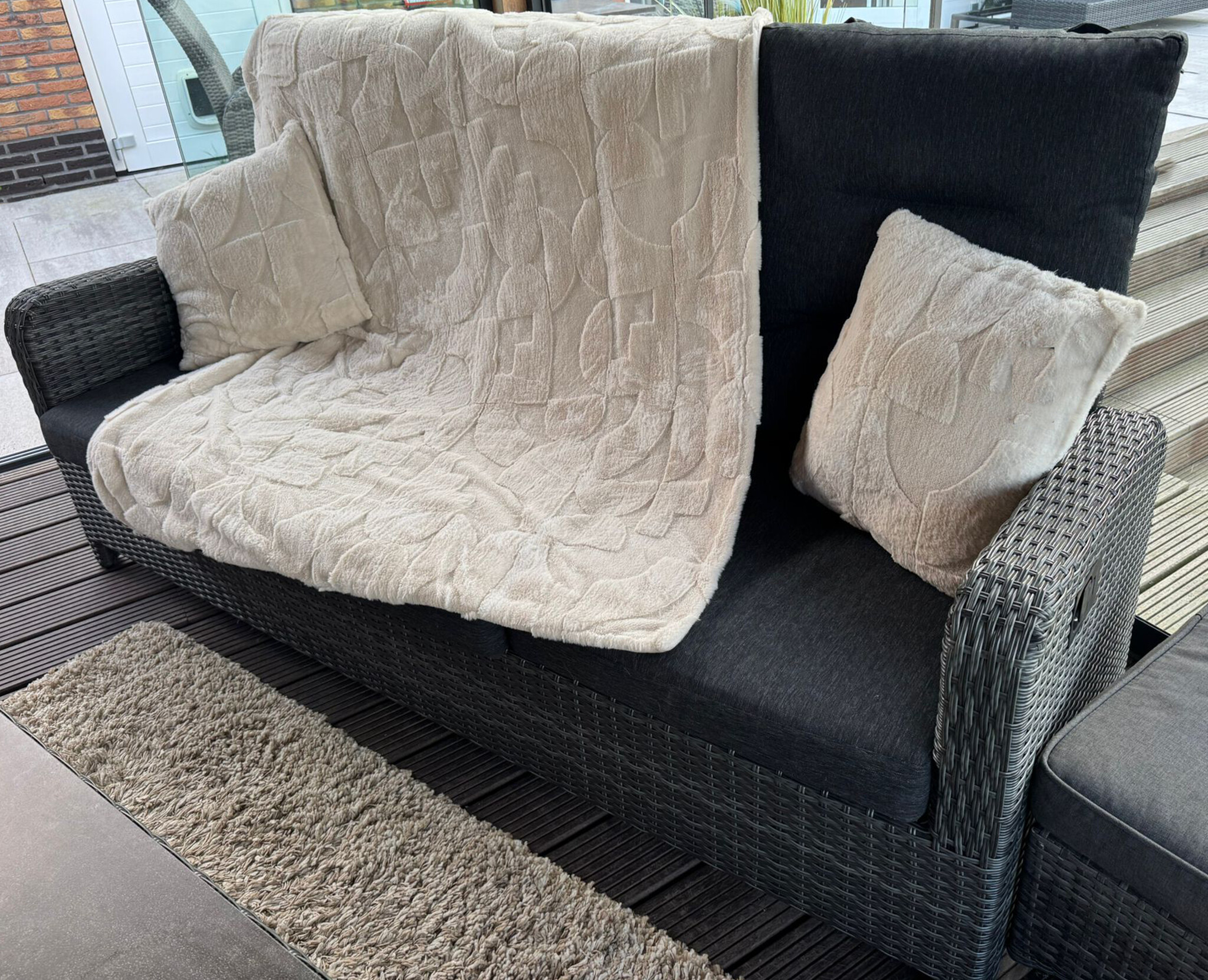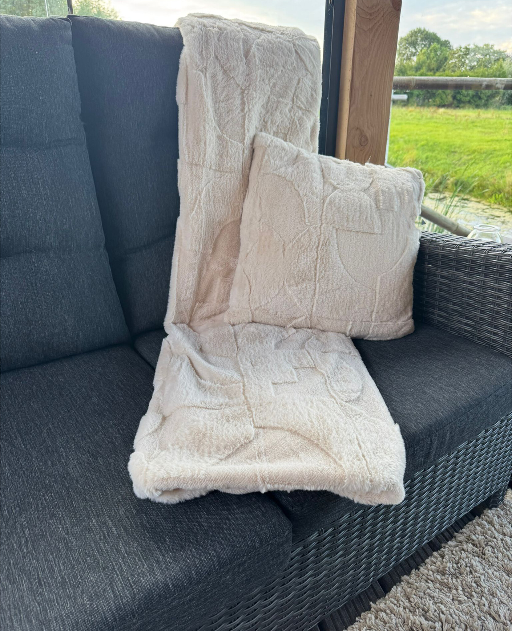 HEM imitatie bont plaid 130x160 cm met 2 sierkussens. Zachte polyester woonplaid en kussenset voor bank of fauteuil. Luxe, warm en fluffy woondecoratie. Ideaal als cozy plaid en kussen set of cadeau.