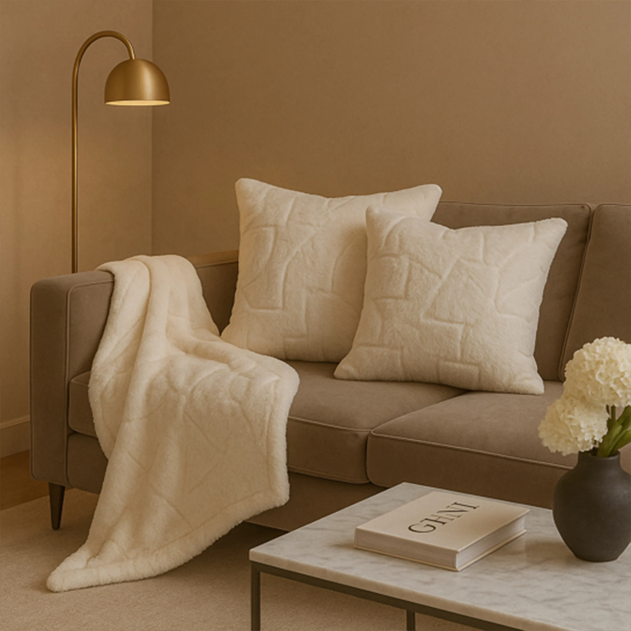 HEM Imitatie Bont Plaid 130x160 cm met 2 Sierkussens – Zacht Polyester – Luxe Kussen en Plaid Set voor Bank of Fauteuil – Woondecoratie - Zandkleur - BeigeTaupe - Warm Creme