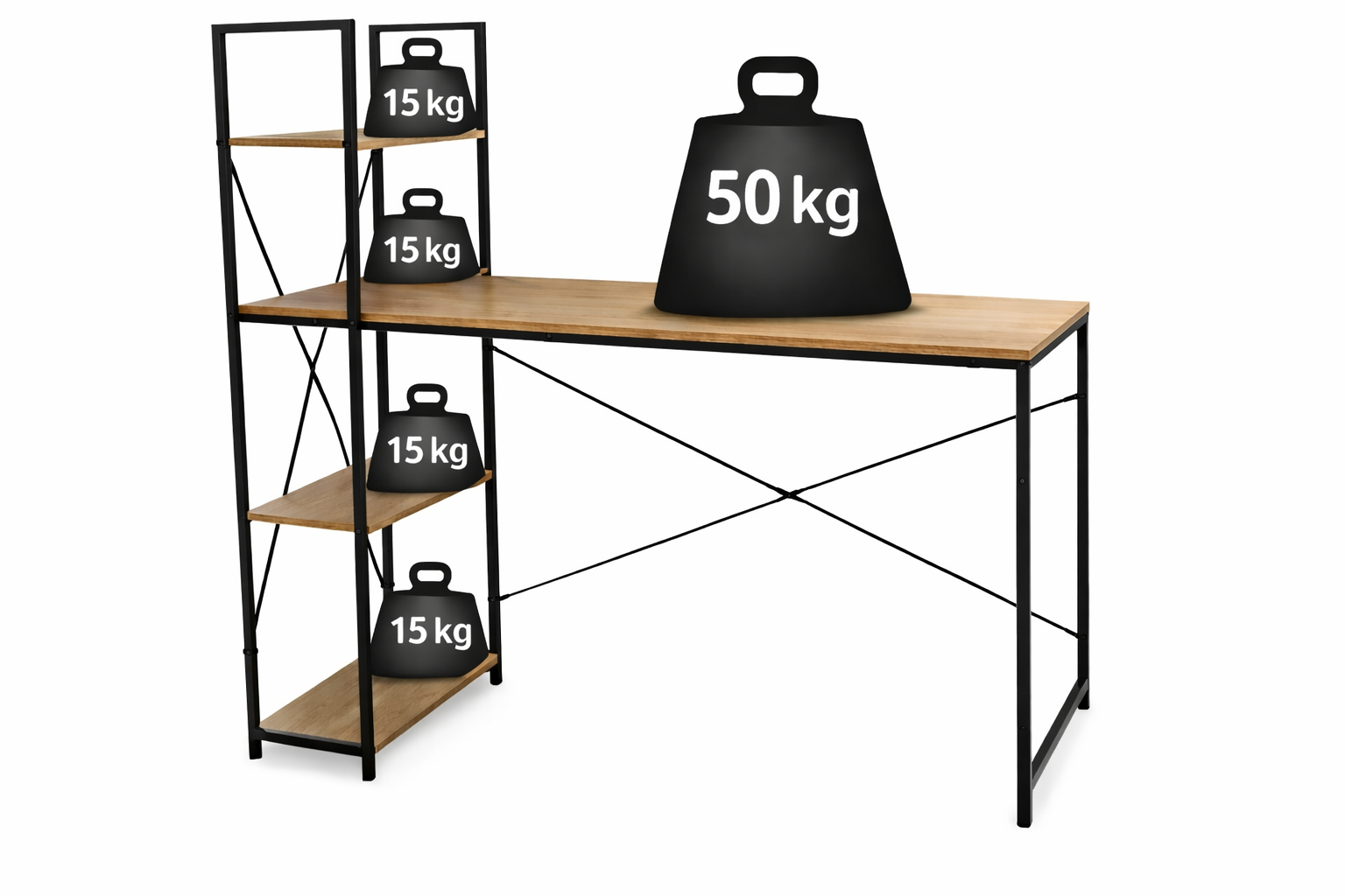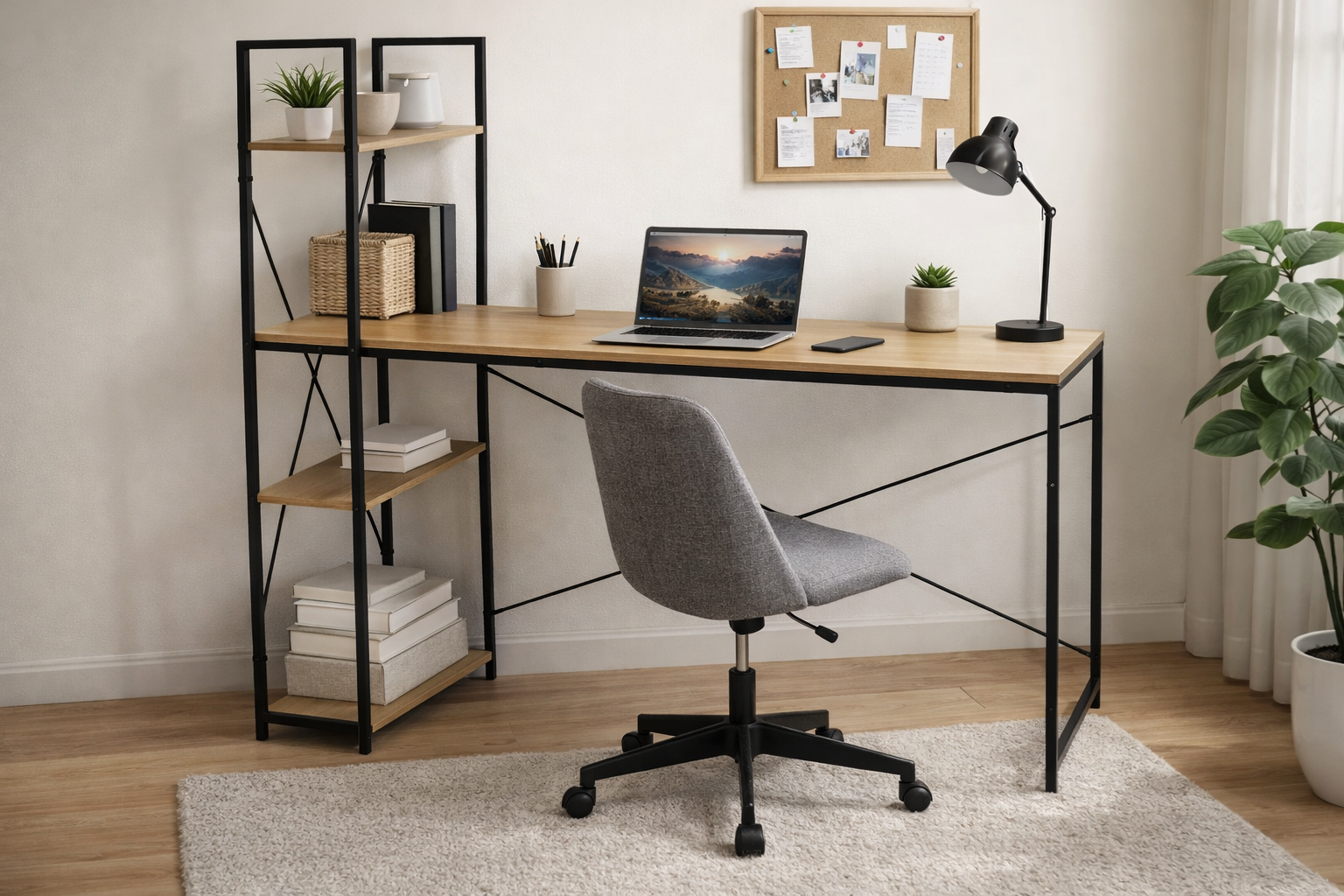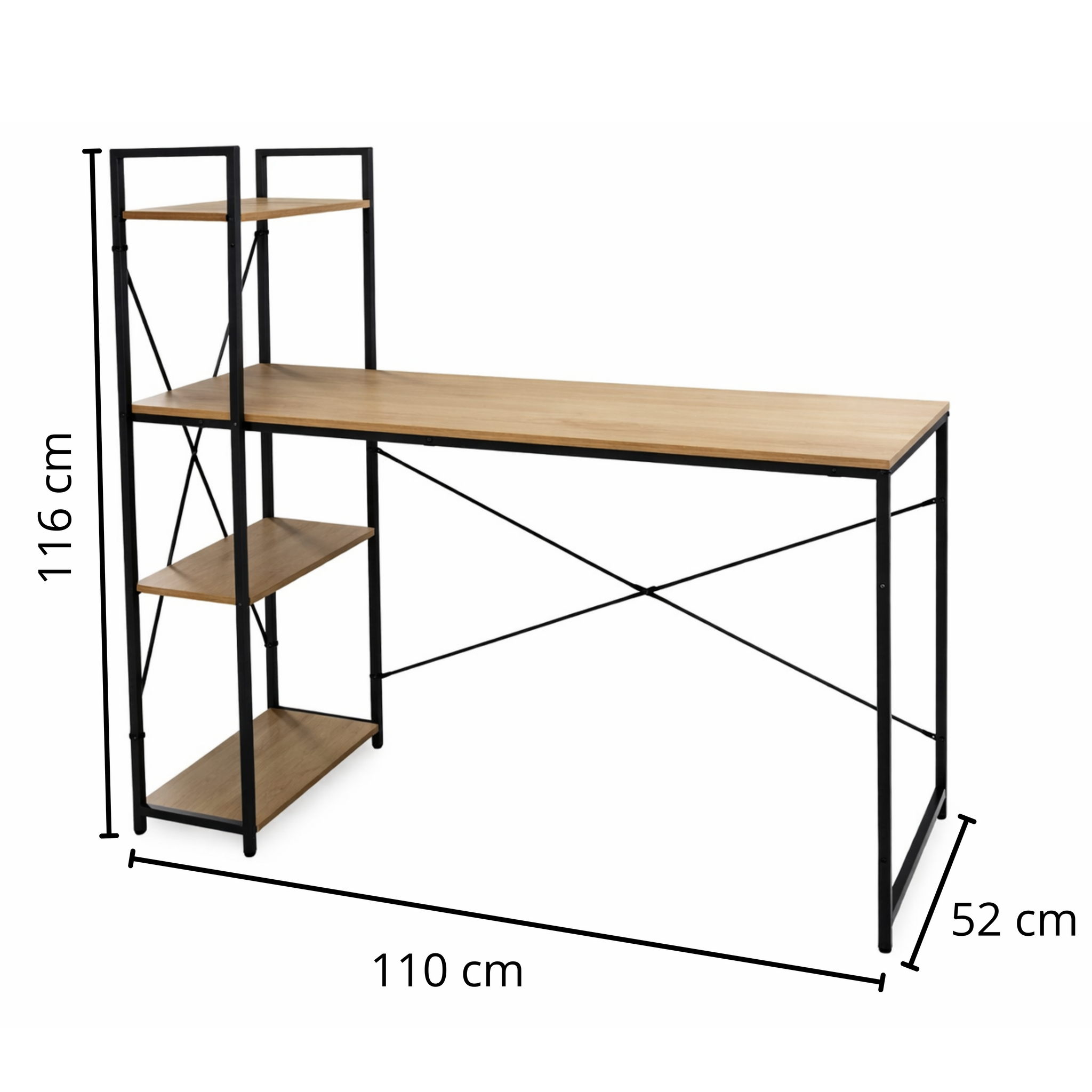 Dankzij het geïntegreerde opbergrek met meerdere schappen creëer je eenvoudig extra ruimte voor boeken, ordners, accessoires of decoratie. Zo blijft je werkblad overzichtelijk en georganiseerd. Met een breedte van 110 cm biedt dit bureau voldoende werkruimte voor een laptop, monitor of studieboeken, zonder dat het veel ruimte inneemt.