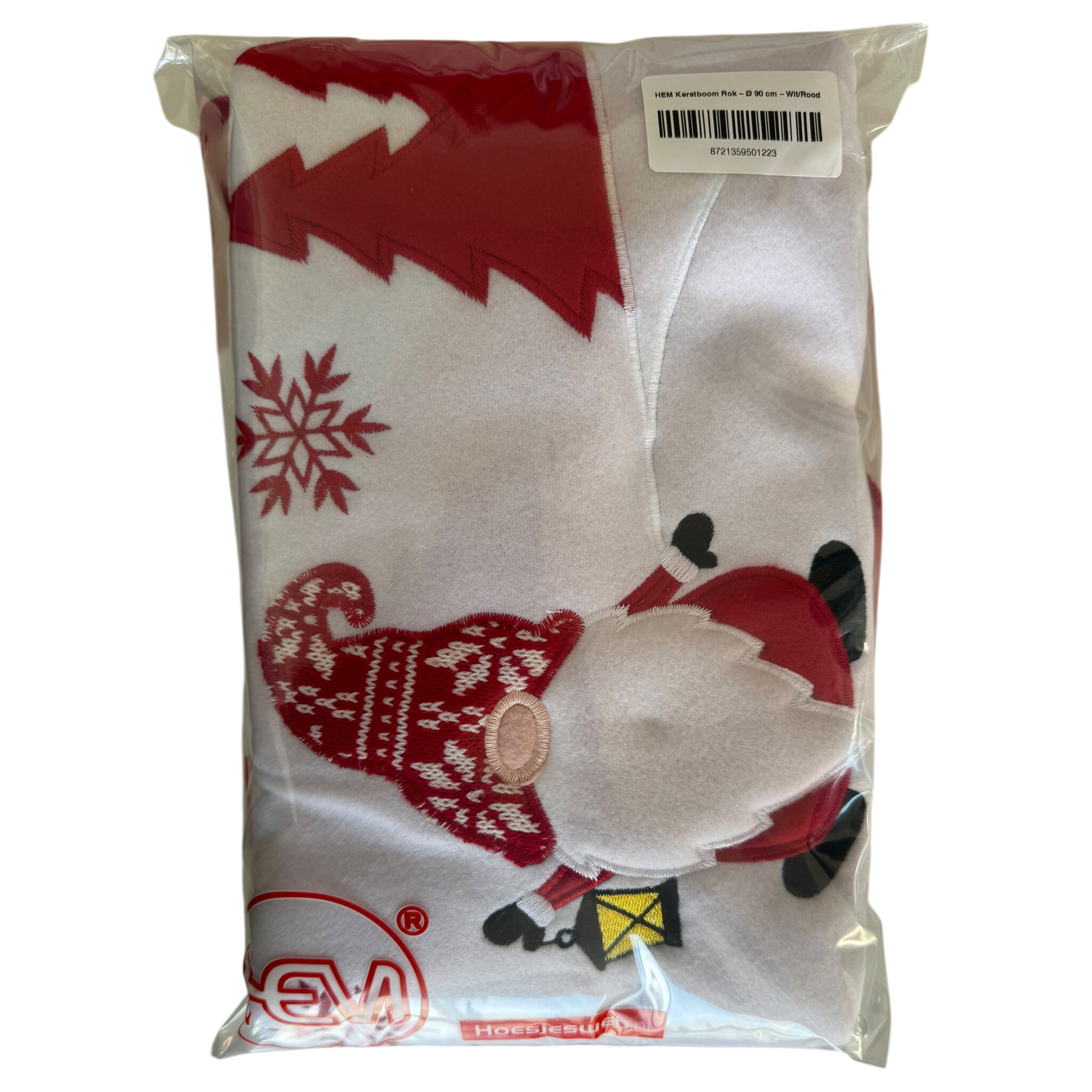 Maak je kerstboom compleet met deze sfeervolle HEM kerstboom rok. Dit boomkleed met vrolijke gnoom opdruk geeft je kerstboom een speelse en gezellige uitstraling. Met een doorsnede van 90 cm past de rok perfect onder zowel kleine als middelgrote bomen. Het zachte fleece materiaal in rood en wit bedekt de boomvoet stijlvol en zorgt voor een warme kerstsfeer in huis.
