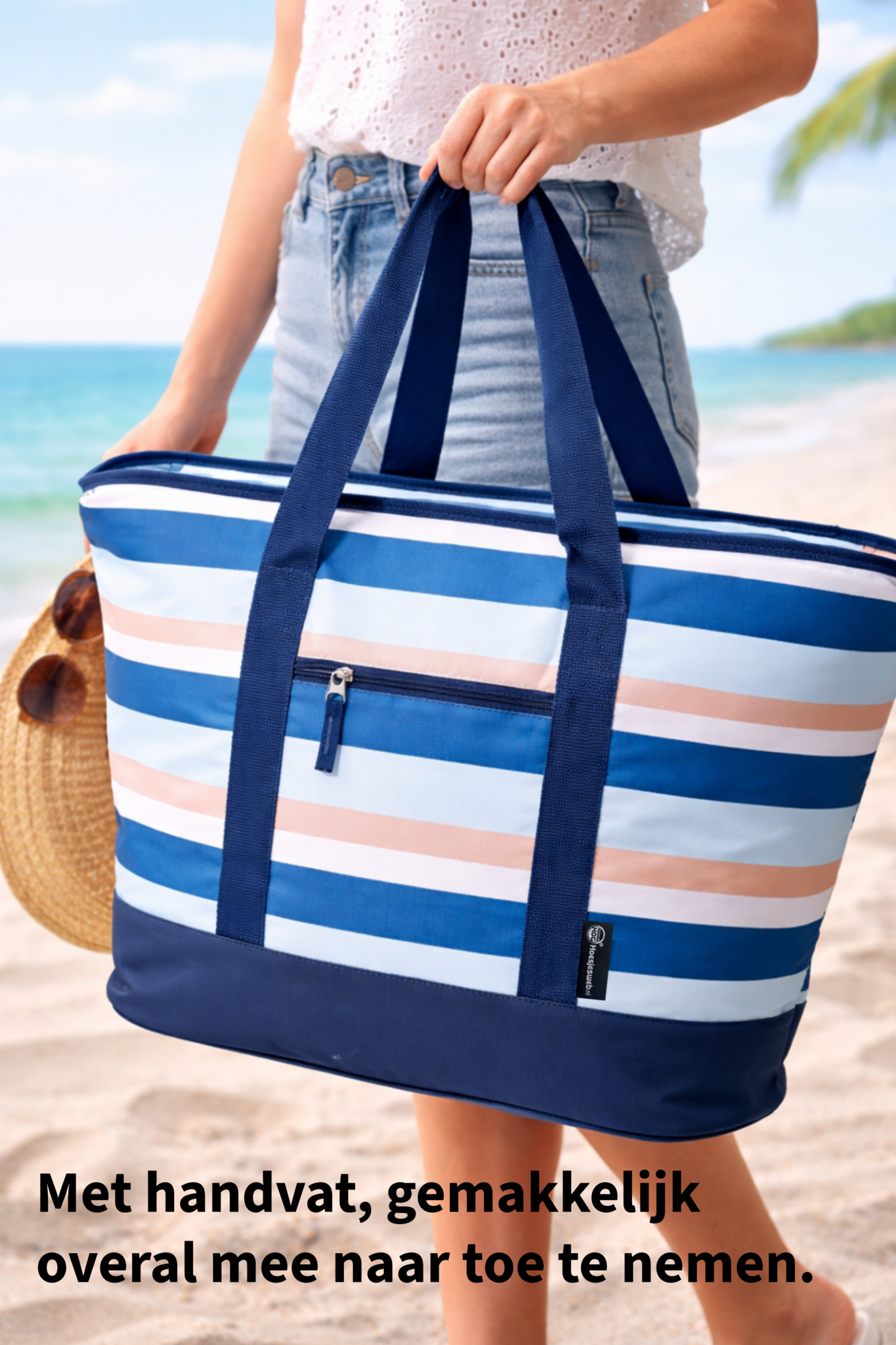 De HEM Koeltas 24 liter is een ruime en stijlvolle strandtas met koelvak, ideaal voor zomerse dagen aan het strand, picknicks in het park of het meenemen van gekoelde boodschappen. Het frisse gestreepte design maakt deze koeltas niet alleen praktisch, maar ook perfect passend bij vakantie en outdoor gebruik.