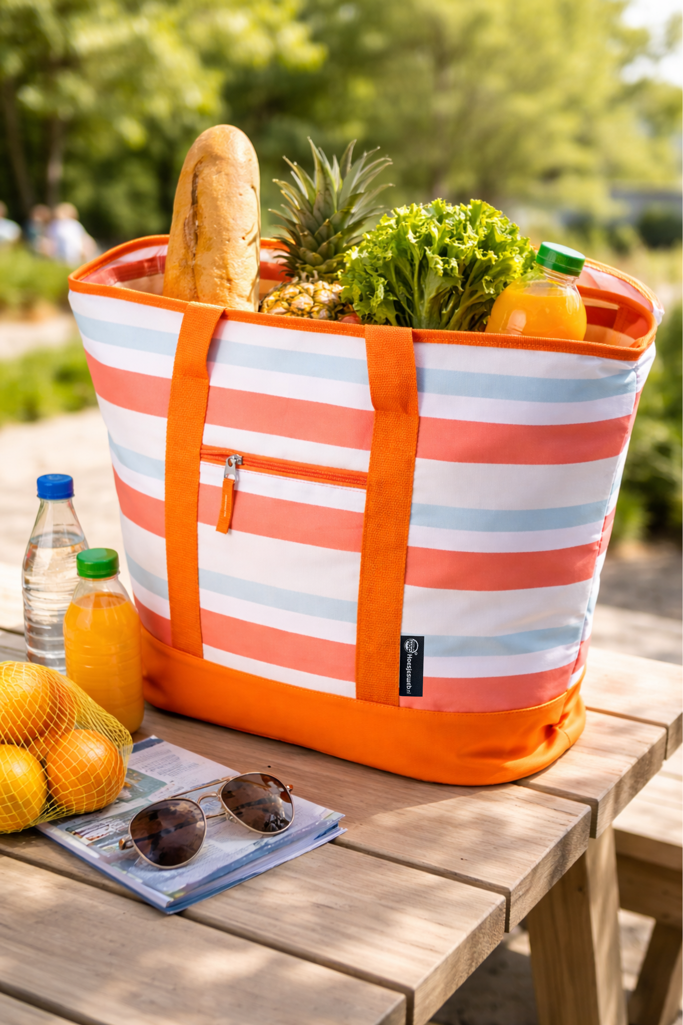 Deze koeltas shopper is geschikt voor het strand, picknick, vakantie, boodschappen en festivals en combineert functionaliteit met een frisse zomerse uitstraling.