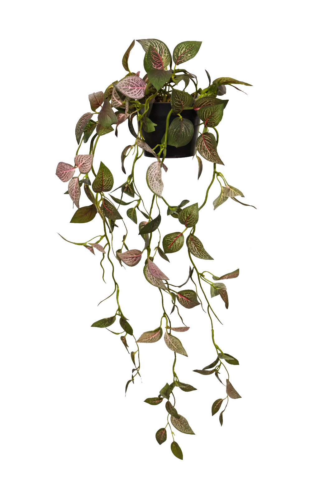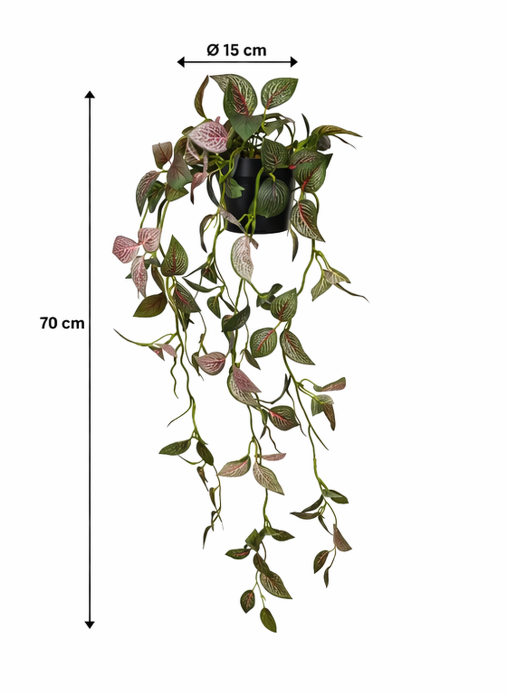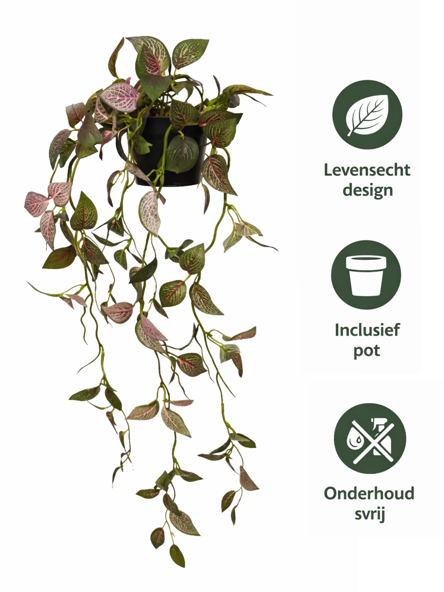 Breng direct warmte en sfeer in huis met de stijlvolle HEM kunst hangplant Fittonia. Deze prachtige kunstplant van 70 cm lang heeft een speelse, volle uitstraling dankzij de veelkleurige bladeren met fijne nerven. De combinatie van groen- en roodtinten zorgt voor een levensechte look, zonder dat je er ooit naar om hoeft te kijken.