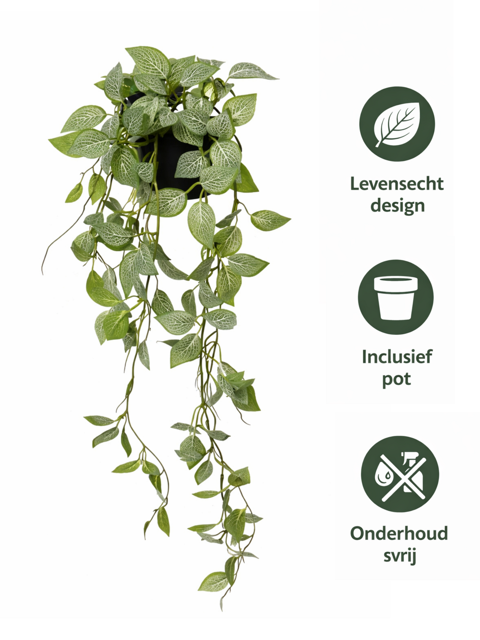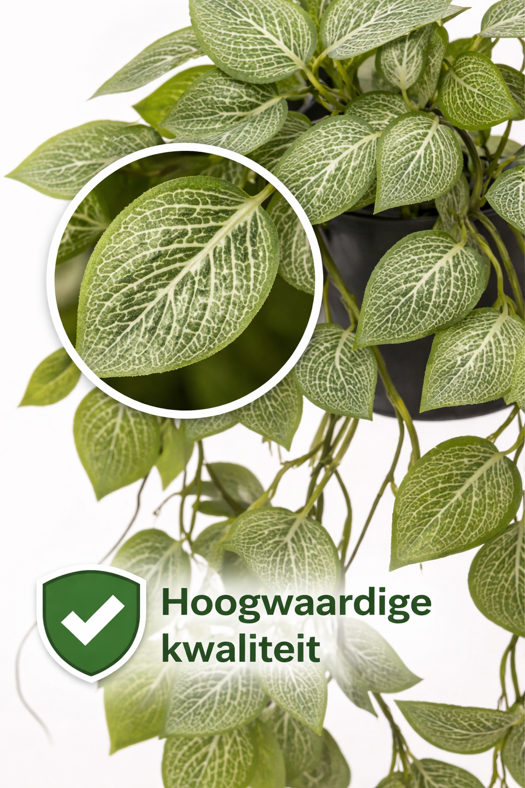 Breng rust en natuurlijke sfeer in huis met de HEM kunst hangplant Fittonia in groene uitvoering. Dankzij de fijn gedetailleerde bladeren met subtiele nerven oogt deze plant bijzonder realistisch en past hij perfect in elk interieur.
