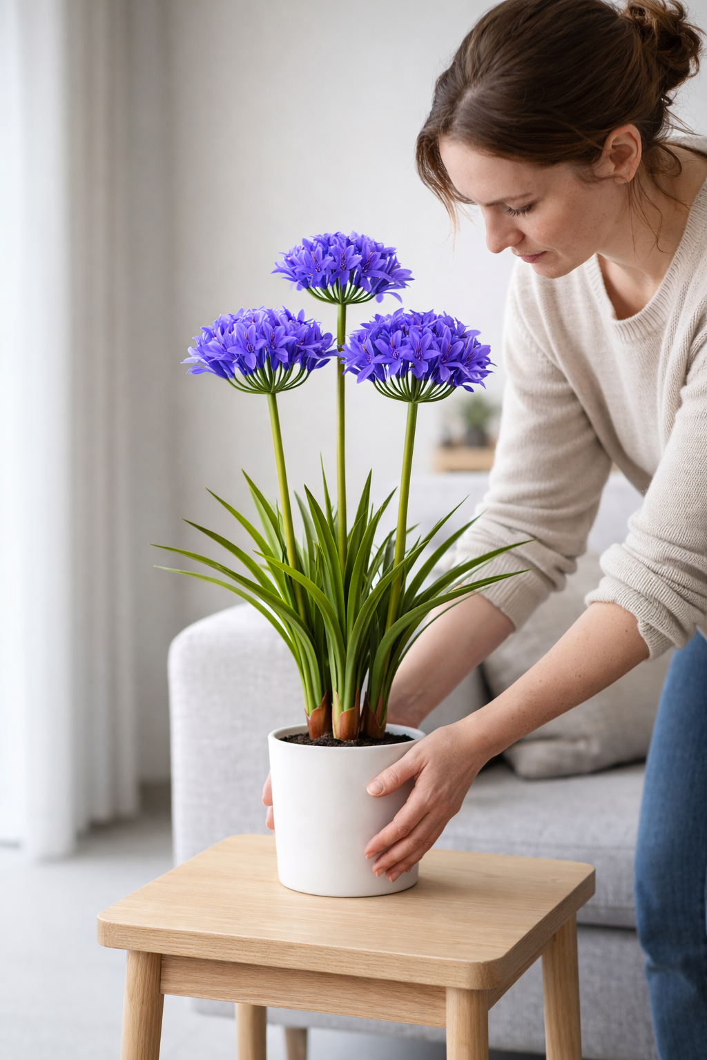 De Agapanthus is uitgevoerd met meerdere stevige groene bladeren en drie volle bloemhoofden, die samen zorgen voor een natuurlijke en realistische uitstraling. Dankzij de zorgvuldige afwerking en verfijnde details is deze kunstplant nauwelijks van echt te onderscheiden. Verkrijgbaar in twee kleuren: wit en paars, zodat je altijd een variant kiest die perfect aansluit bij jouw interieur.