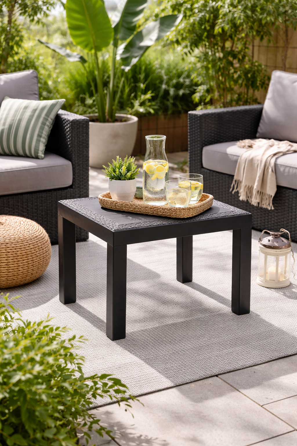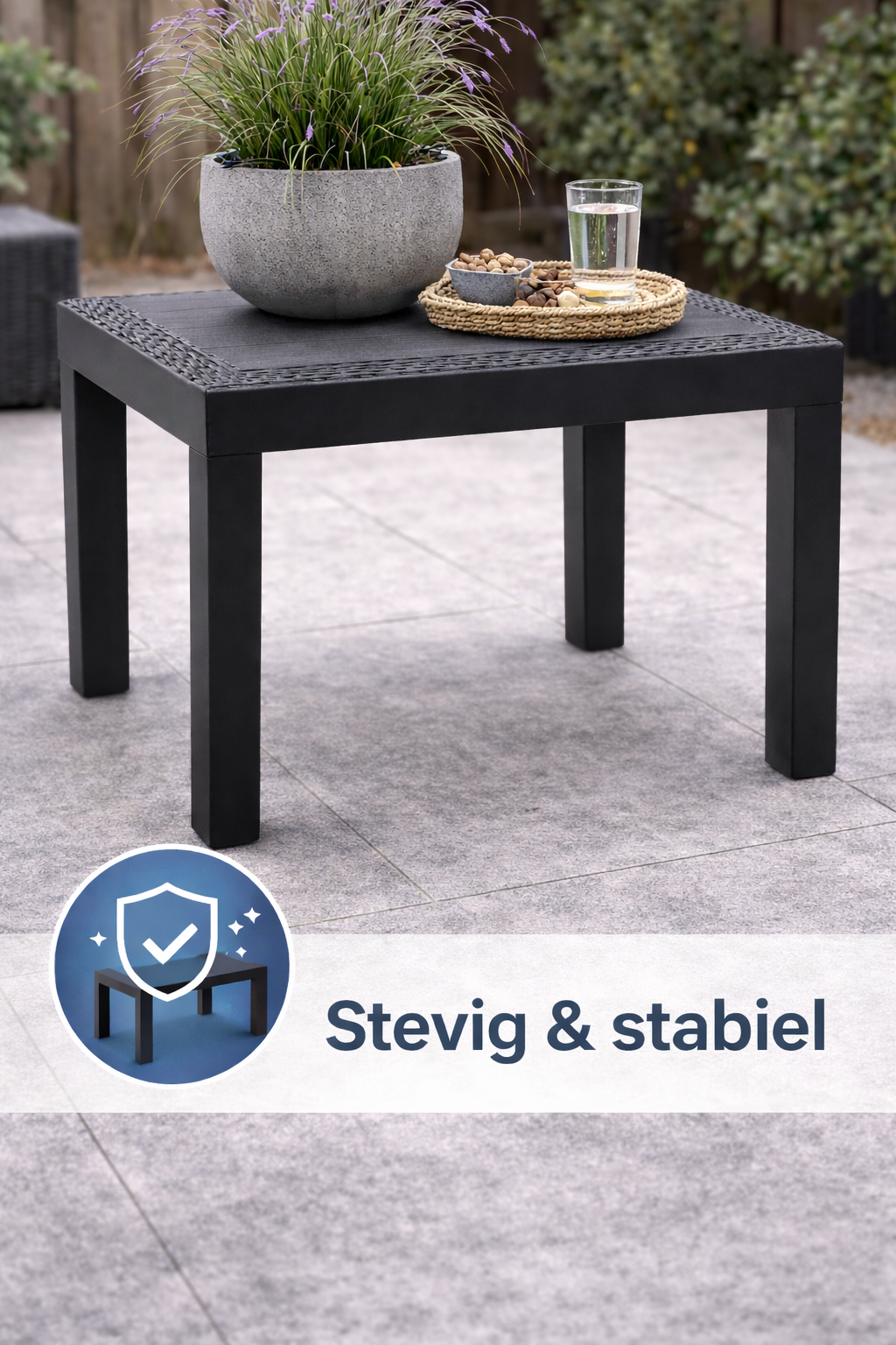 De neutrale antraciet kleur past moeiteloos bij verschillende tuinmeubelen en stijlen. Gebruik de tafel als losse bijzettafel of combineer hem met stoelen voor een complete tuinset.