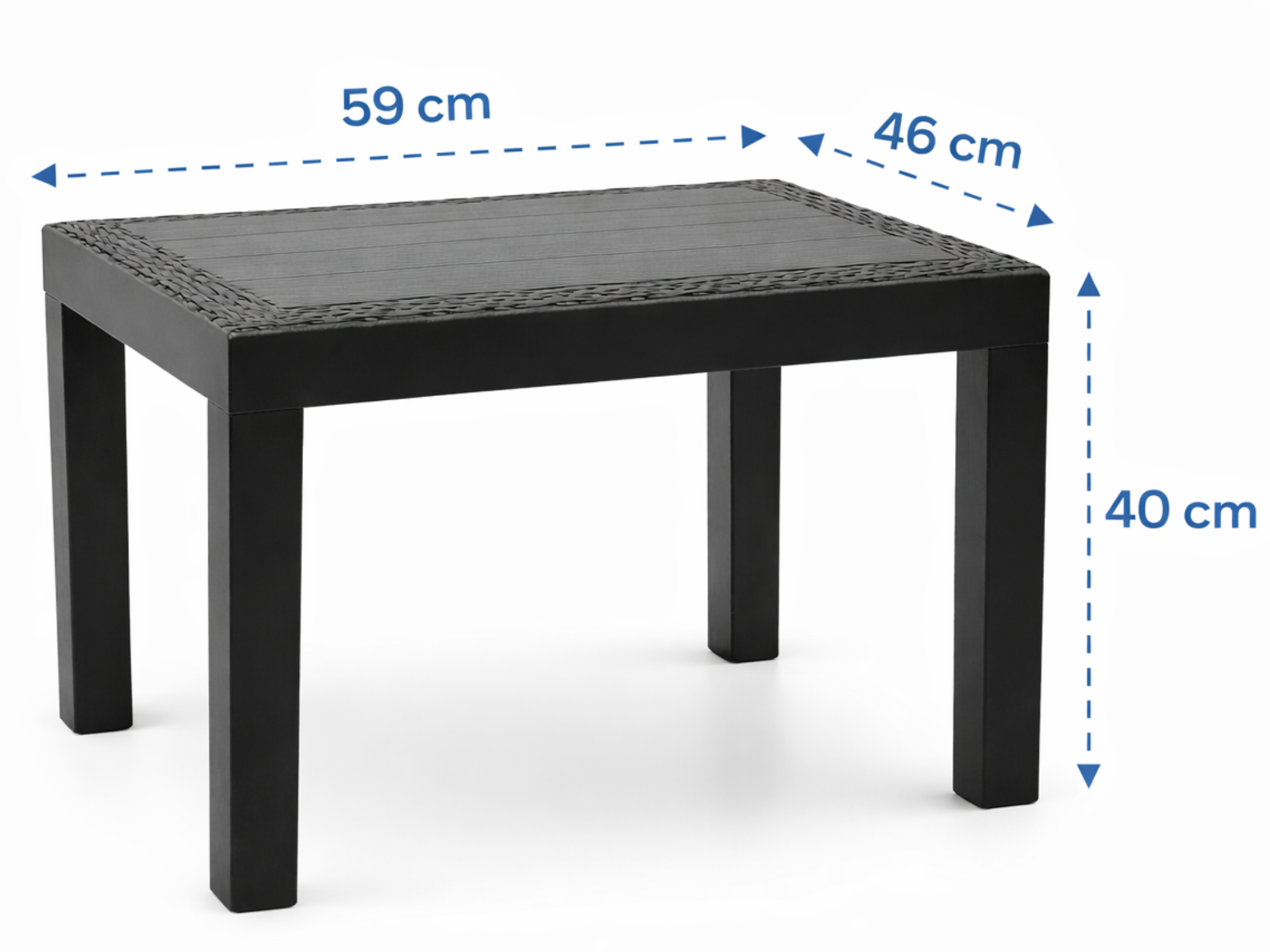 Deze kunststof bijzettafel in antraciet is een praktische en stijlvolle toevoeging aan iedere tuin, balkon of terras. Met een afmeting van 59 x 46 x 40 cm is de tafel compact maar ruim genoeg voor drankjes, hapjes of decoratie. Ideaal als tuin tafel, balkon tafel, campingtafel of extra bijzettafel naast je loungeset.