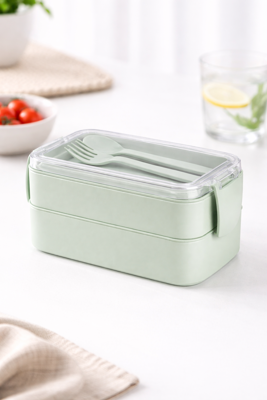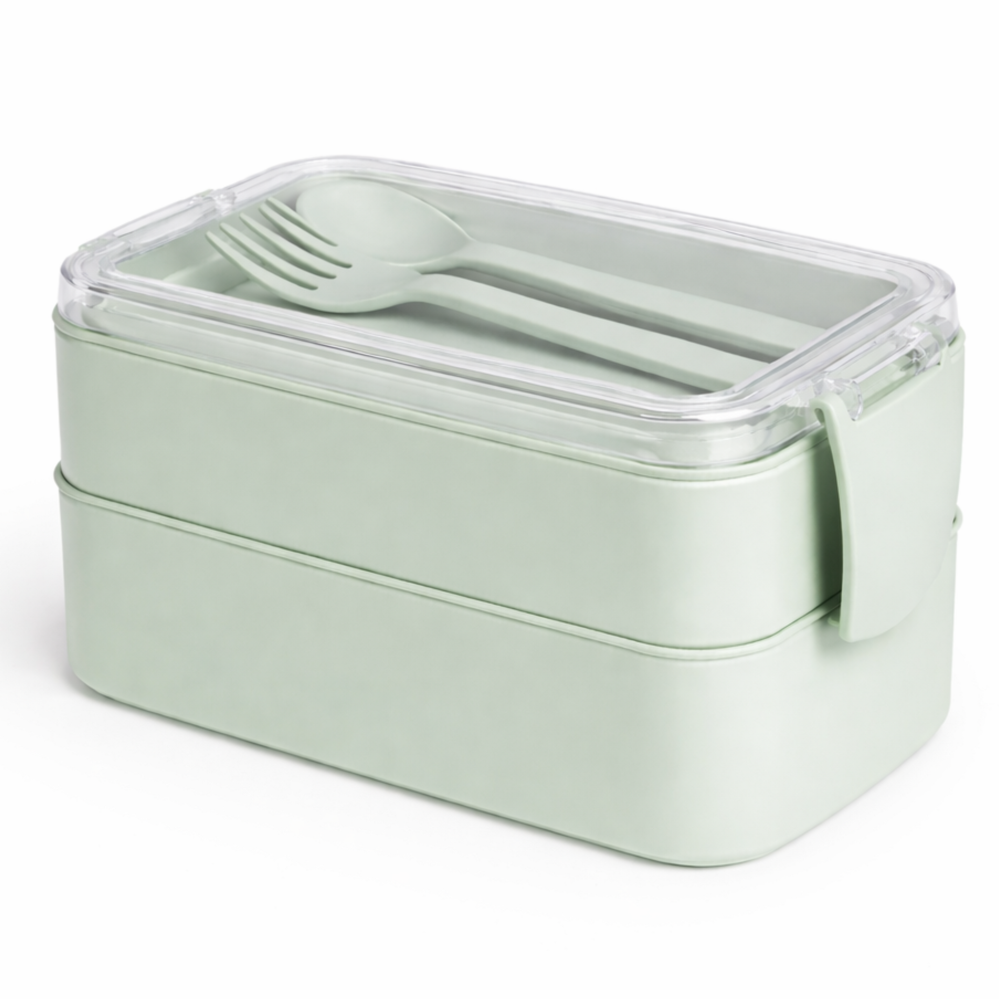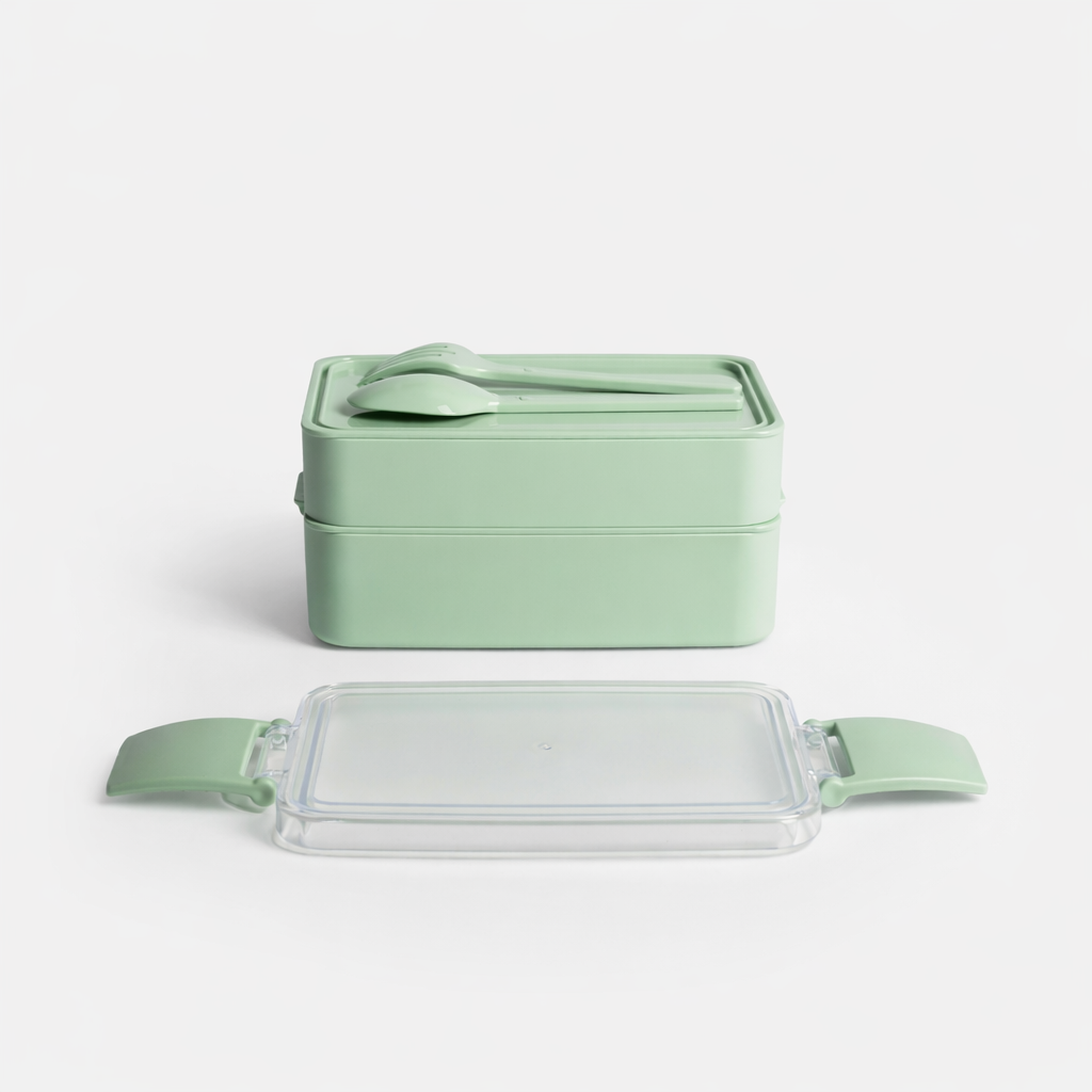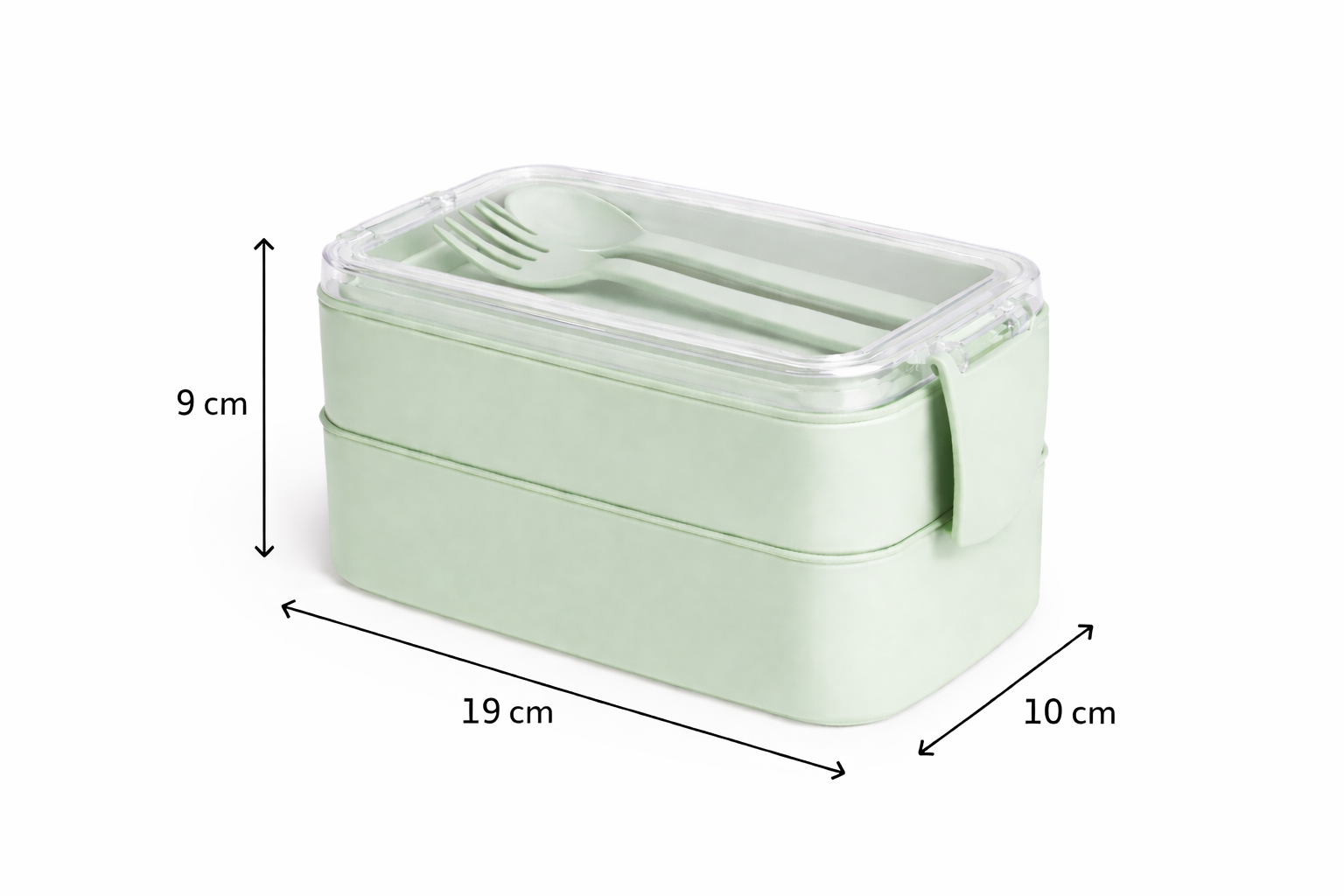 HEM Lunchbox met Bestek – Groen – 2 Laags Bento Box – 19 x 10 x 9 cm – Inclusief Lepel en Vork – Lekvrij – BPA Vrij