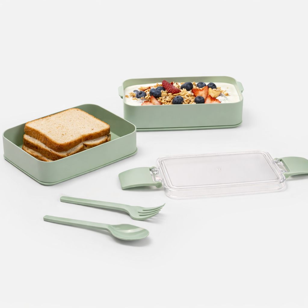 De set wordt geleverd inclusief een bijpassende vork en lepel, zodat je altijd compleet bent – waar je ook bent.