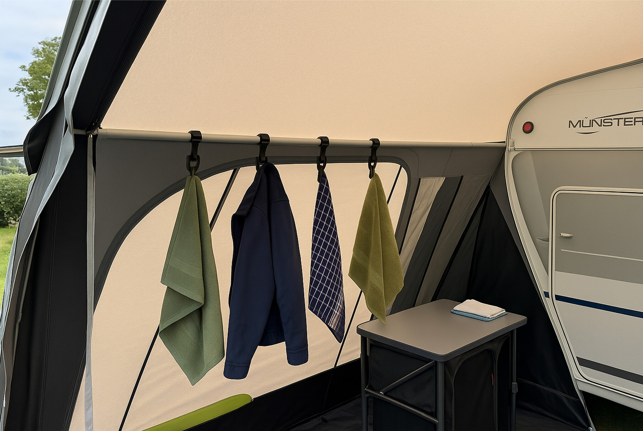 De HEM multifunctionele haakclip is dé oplossing om snel en stevig extra ophangmogelijkheden te creëren. Dankzij de sterke gripklem bevestig je de clip eenvoudig aan voortentbuizen van 19-22 mm of andere stangen in dezelfde maat. Vervolgens gebruik je de haak om lampjes, handdoeken, jassen of andere accessoires aan op te hangen.