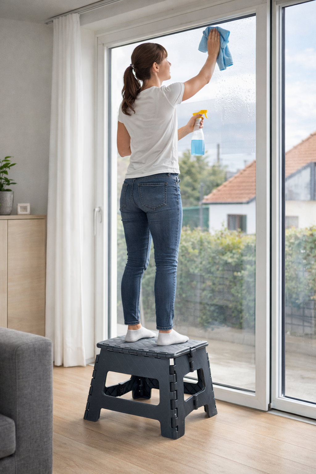 Dankzij het inklapbare ontwerp is de opstapkruk eenvoudig op te bergen wanneer hij niet wordt gebruikt. In ingeklapte toestand neemt hij nauwelijks ruimte in en past hij moeiteloos in een kast, lade of achter de deur. Met een gewicht van slechts ca. 1,2 kg is de kruk lichtgewicht en gemakkelijk te verplaatsen of mee te nemen.