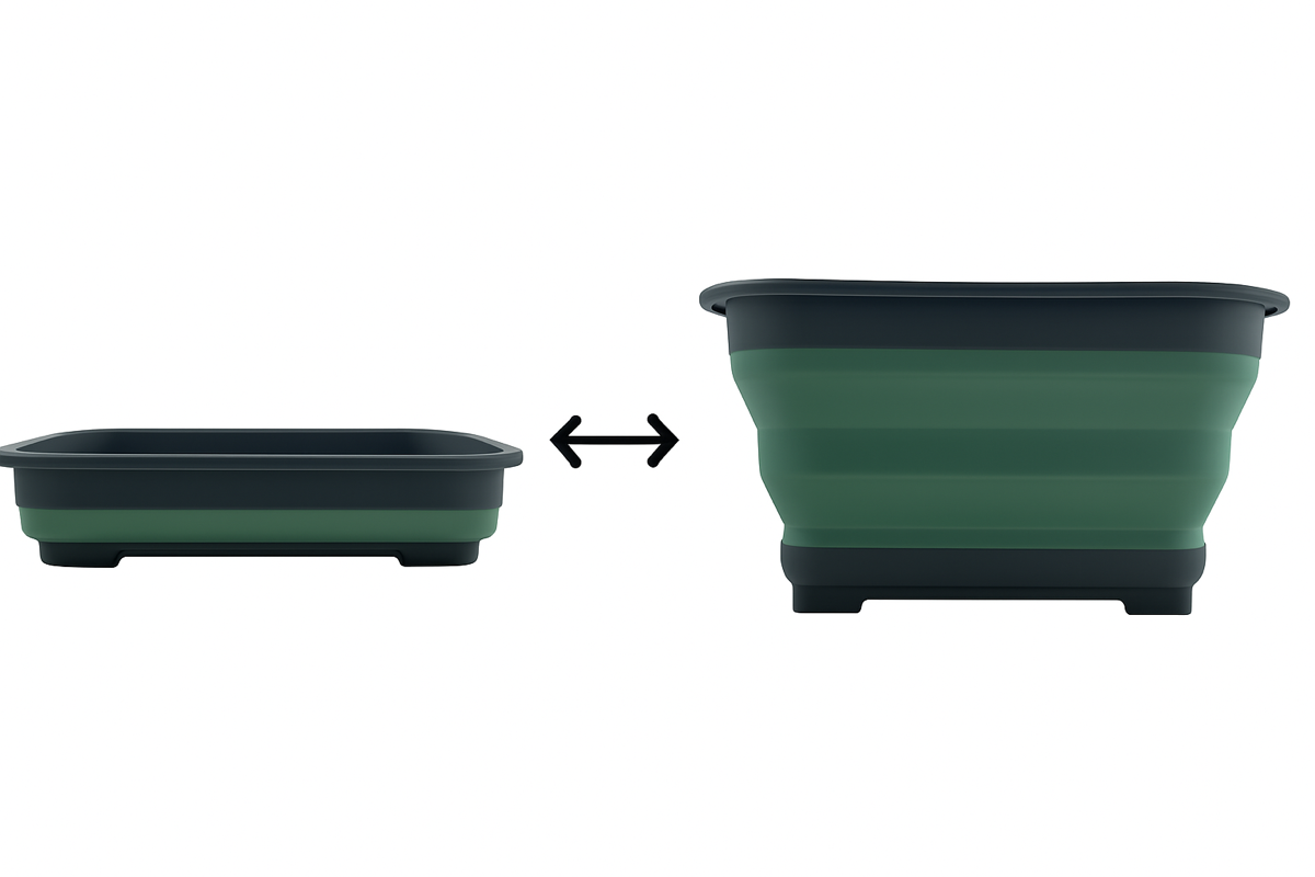 Deze inklapbare wasbak is gemaakt van stevig kunststof en siliconen en combineert het gemak van een afwasteil, teiltje én zelfs een dienblad in één ruimtebesparend ontwerp. Dankzij het slimme vouwmechanisme klap je de bak eenvoudig plat tot een minimale hoogte. Zo neemt hij nauwelijks ruimte in in je keukenkastje, caravan of opbergbox.