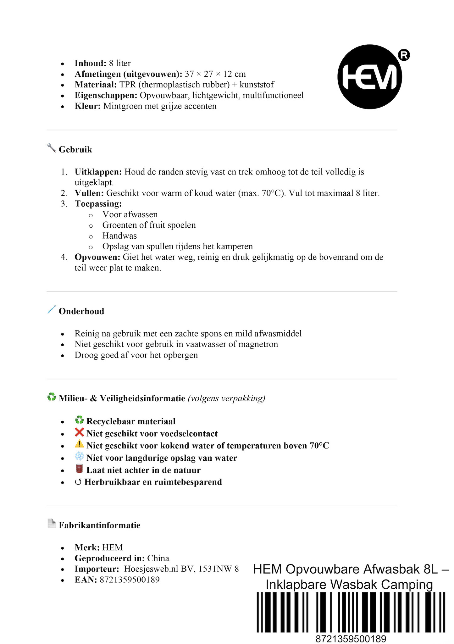 Op zoek naar een praktische, multifunctionele oplossing voor afwassen, spoelen of serveren tijdens het kamperen? De HEM opvouwbare afwasbak van 8 liter is de perfecte metgezel voor camping, caravan, camper, boot of gewoon voor in de keuken thuis.