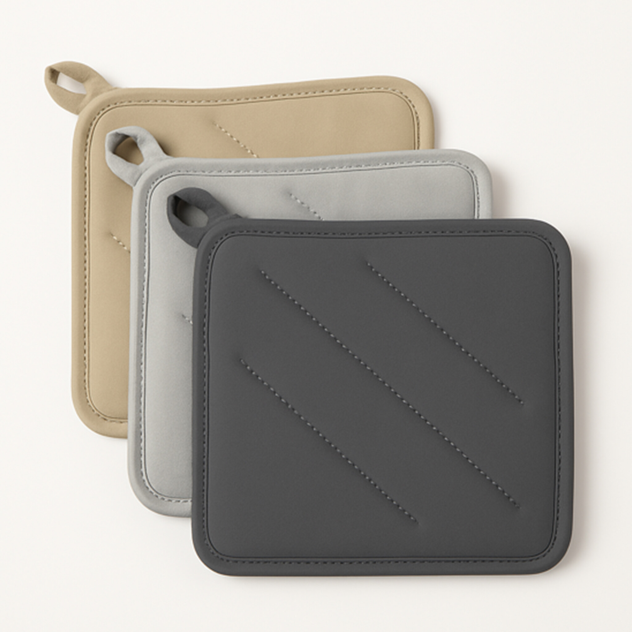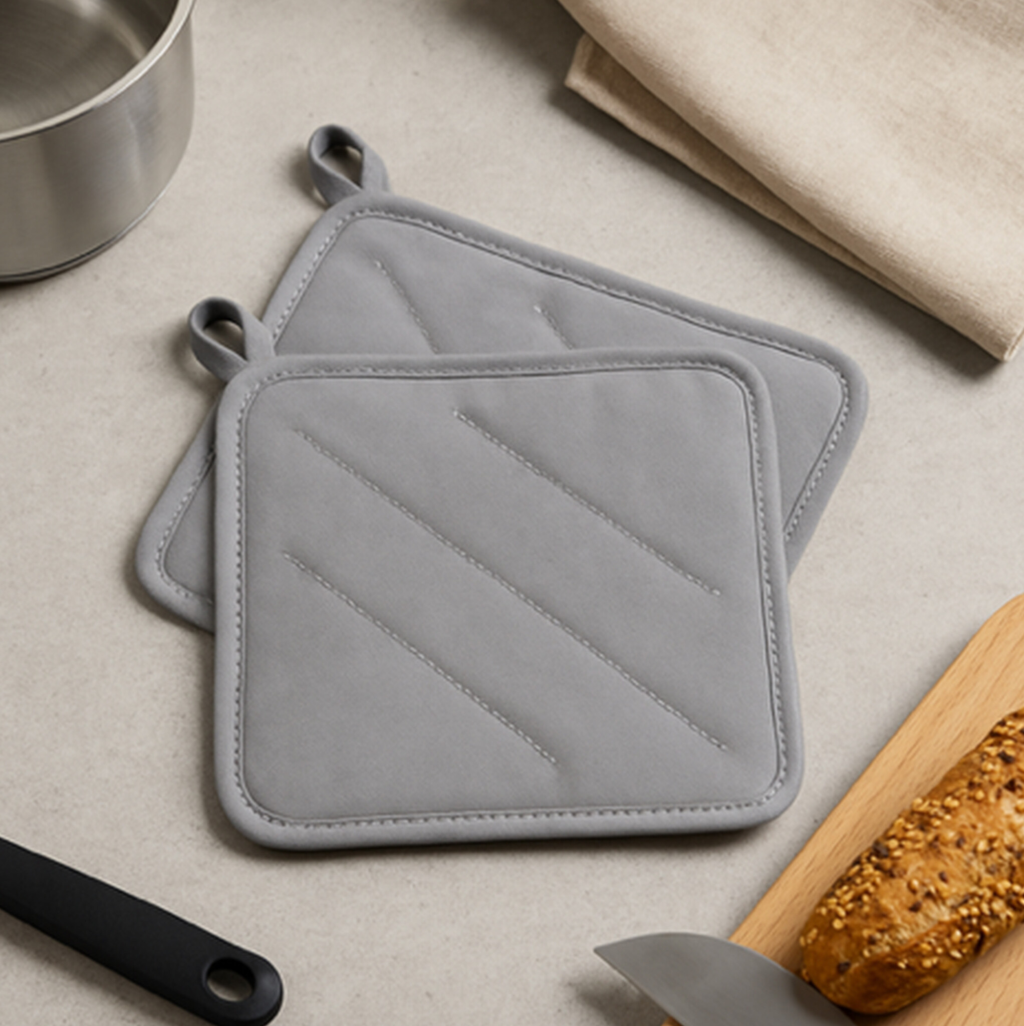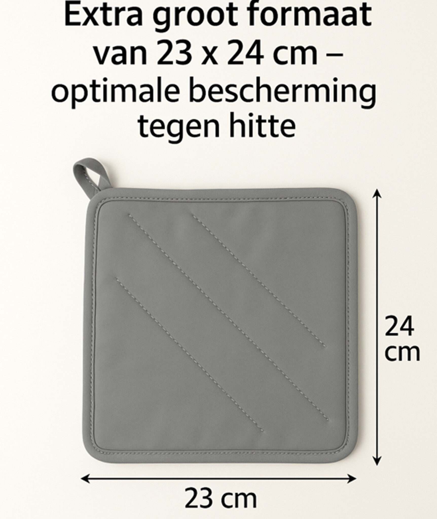 De pannenlappen zijn verkrijgbaar in drie stijlvolle kleuren: lichtgrijs, donkergrijs en taupe – passend in elk keukendesign. Dankzij de ophanglus zijn ze eenvoudig op te bergen en altijd binnen handbereik. Of je nu een ovenschotel uit de oven haalt of een pan van het vuur, met deze set van twee pannenlappen doe je dat veilig én in stijl.
