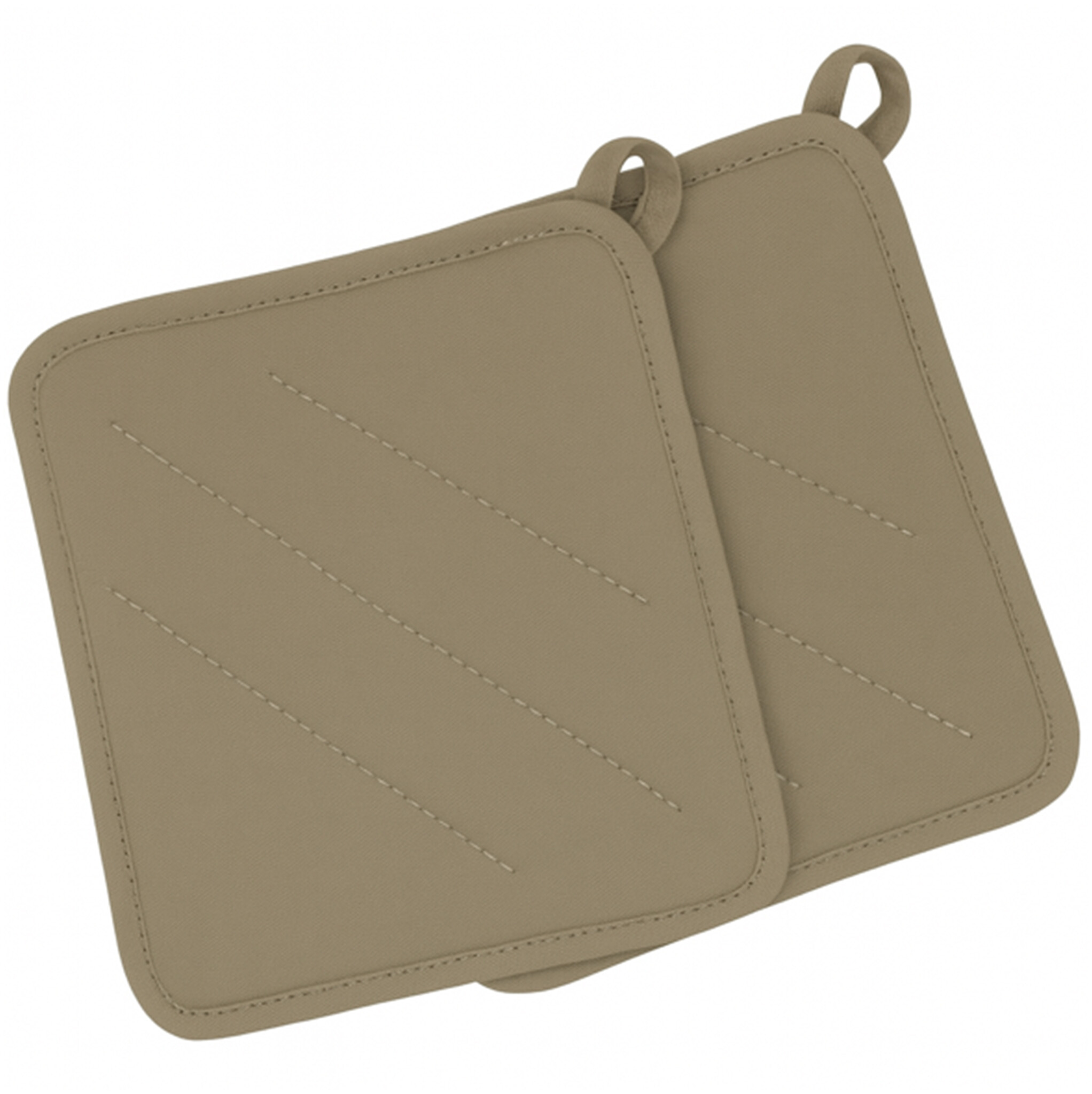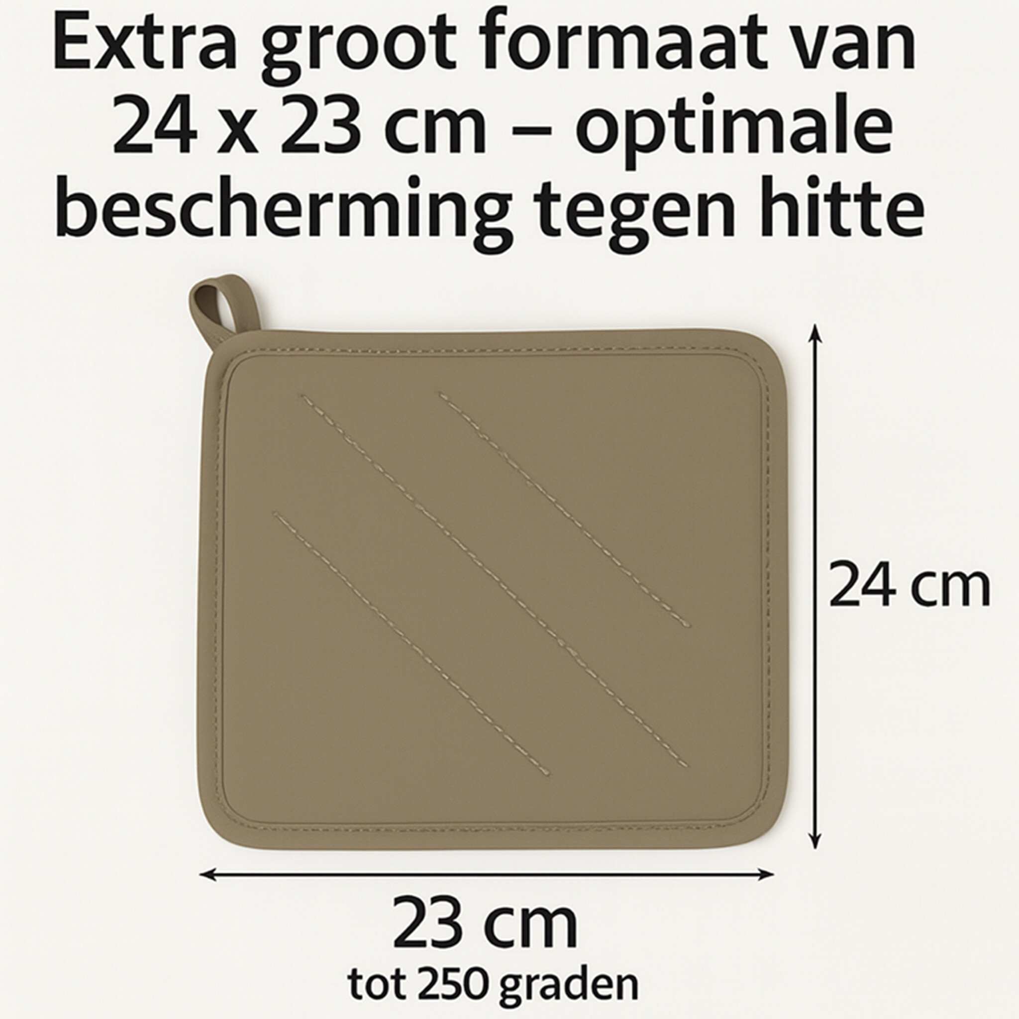 De pannenlappen zijn verkrijgbaar in drie stijlvolle kleuren: lichtgrijs, donkergrijs en taupe – passend in elk keukendesign. Dankzij de ophanglus zijn ze eenvoudig op te bergen en altijd binnen handbereik. Of je nu een ovenschotel uit de oven haalt of een pan van het vuur, met deze set van twee pannenlappen doe je dat veilig én in stijl.