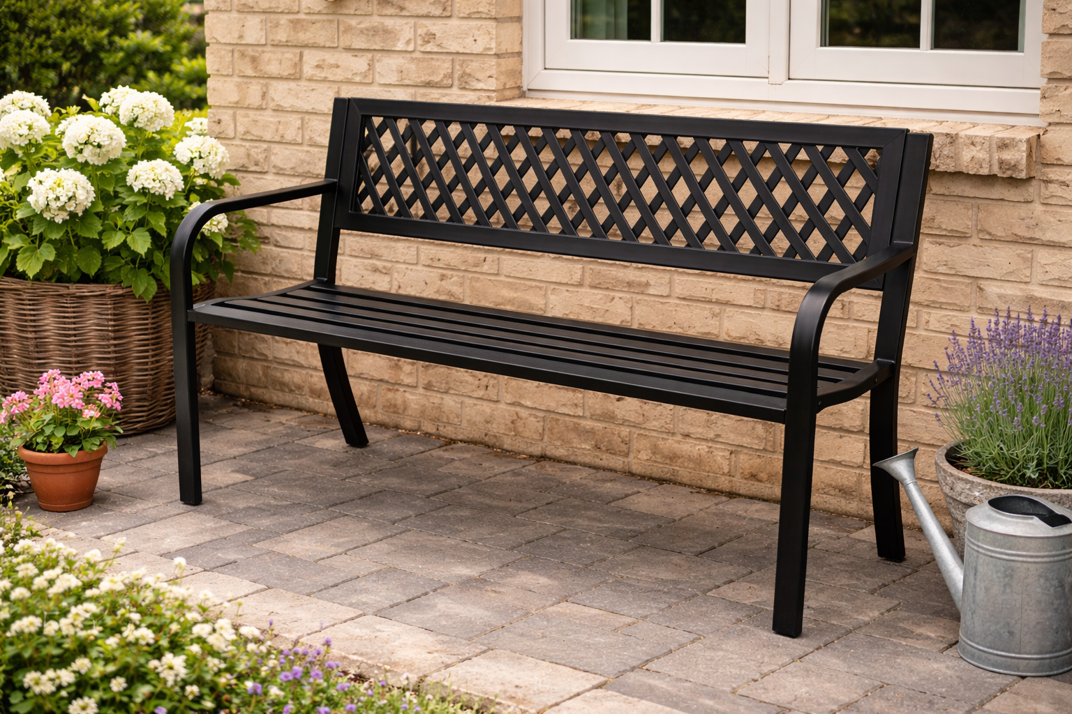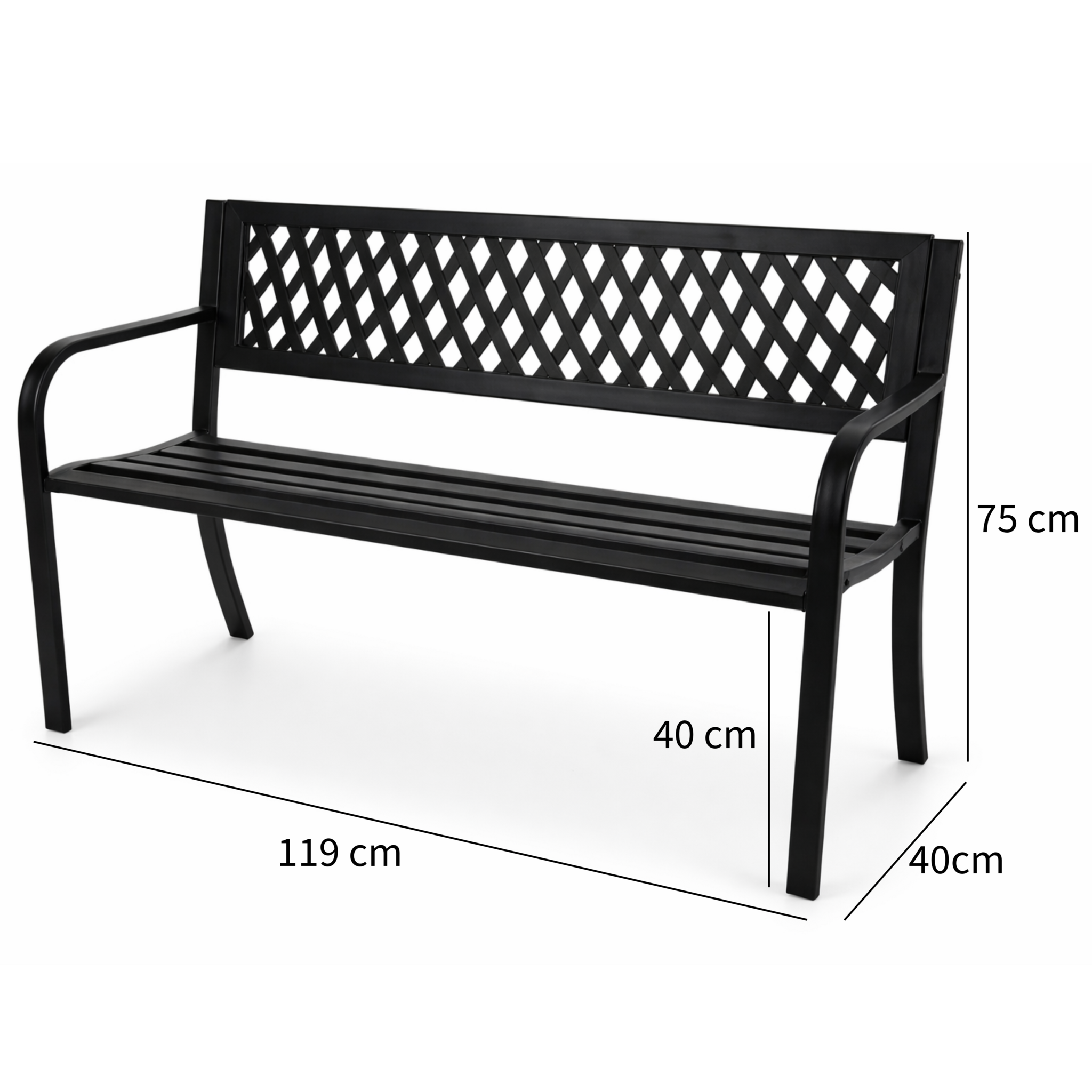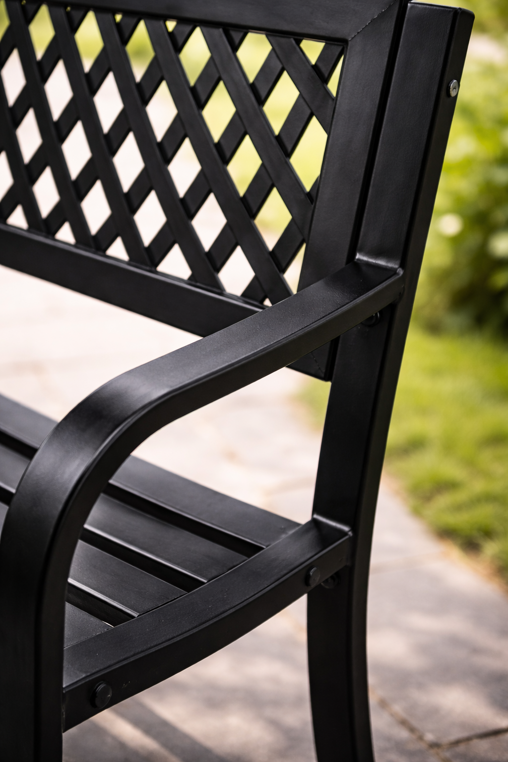 Deze zwarte stalen tuinbank is een praktische en stijlvolle zitoplossing voor buiten en ideaal voor wie op zoek is naar een onderhoudsvriendelijke, sterke en betaalbare tuinbank.