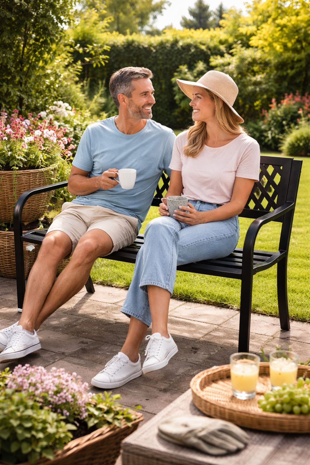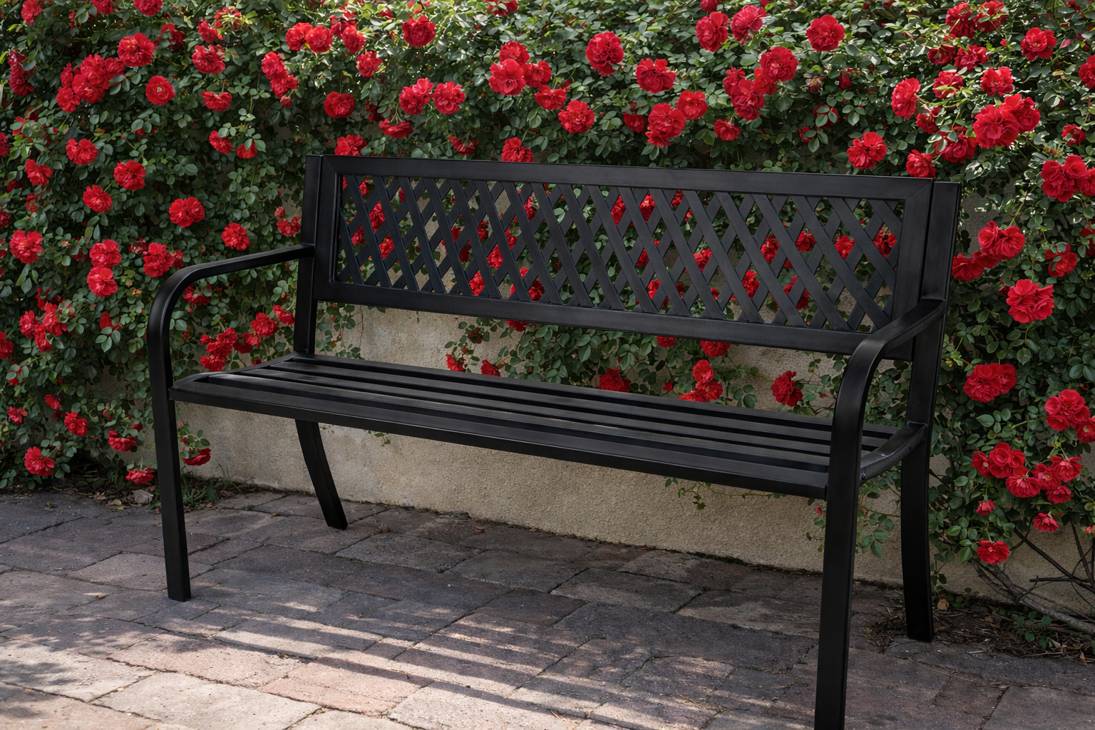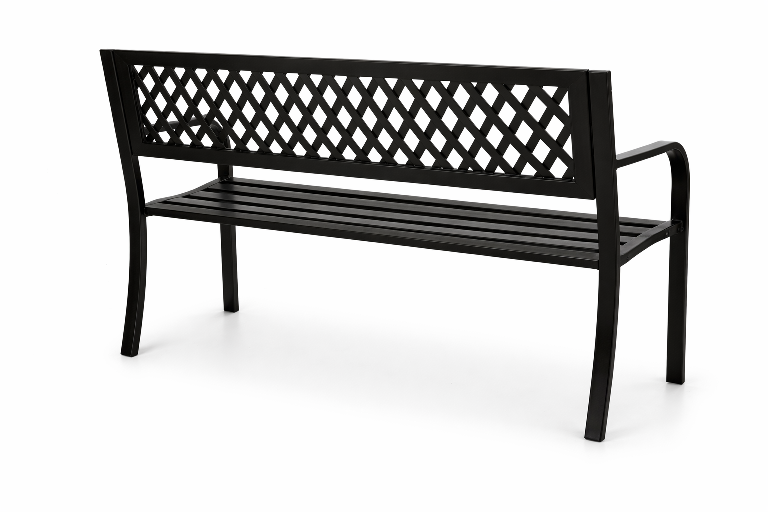 Deze zwarte stalen tuinbank is een praktische en stijlvolle zitoplossing voor buiten en ideaal voor wie op zoek is naar een onderhoudsvriendelijke, sterke en betaalbare tuinbank.