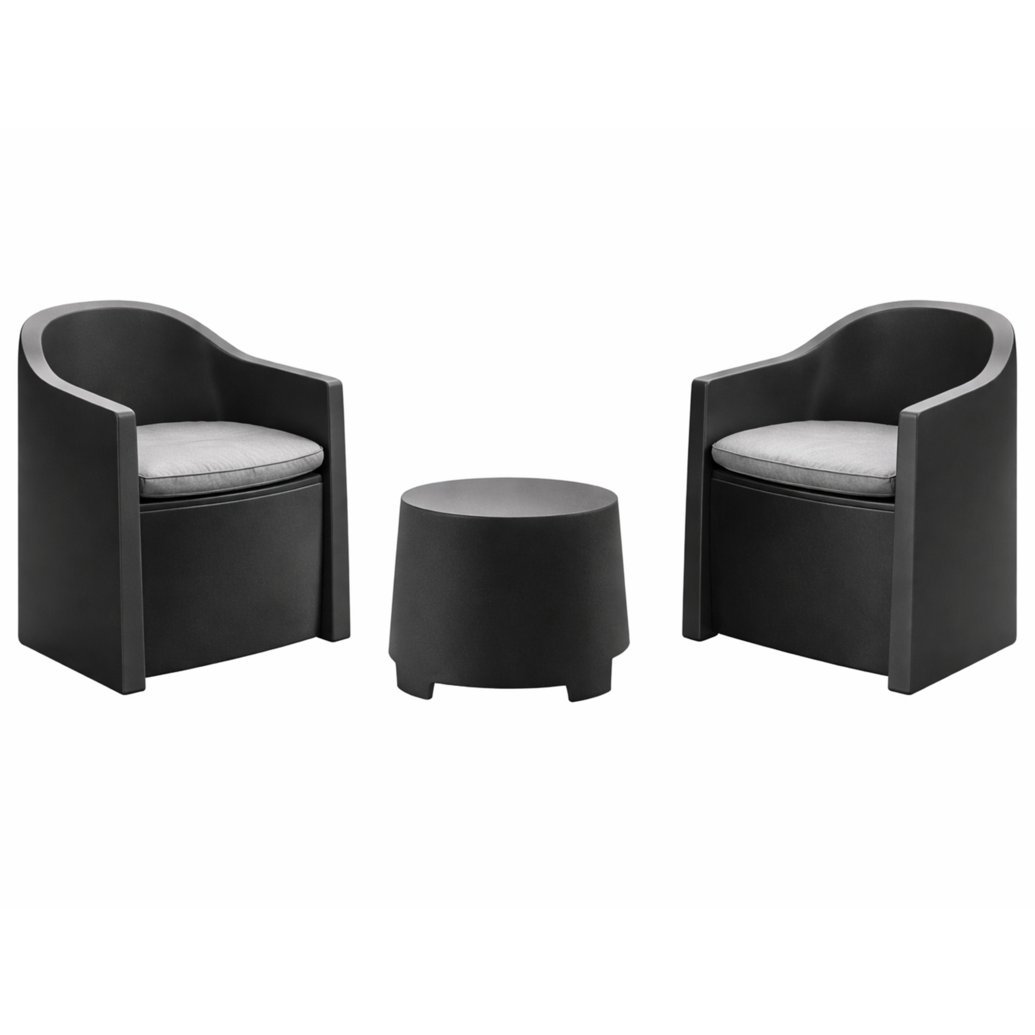 Creëer een ontspannen loungeplek voor twee personen met deze moderne 3-delige tuinset in antraciet. De set bestaat uit twee comfortabele stoelen met bijpassende grijze zitkussens en een praktische bijzettafel.