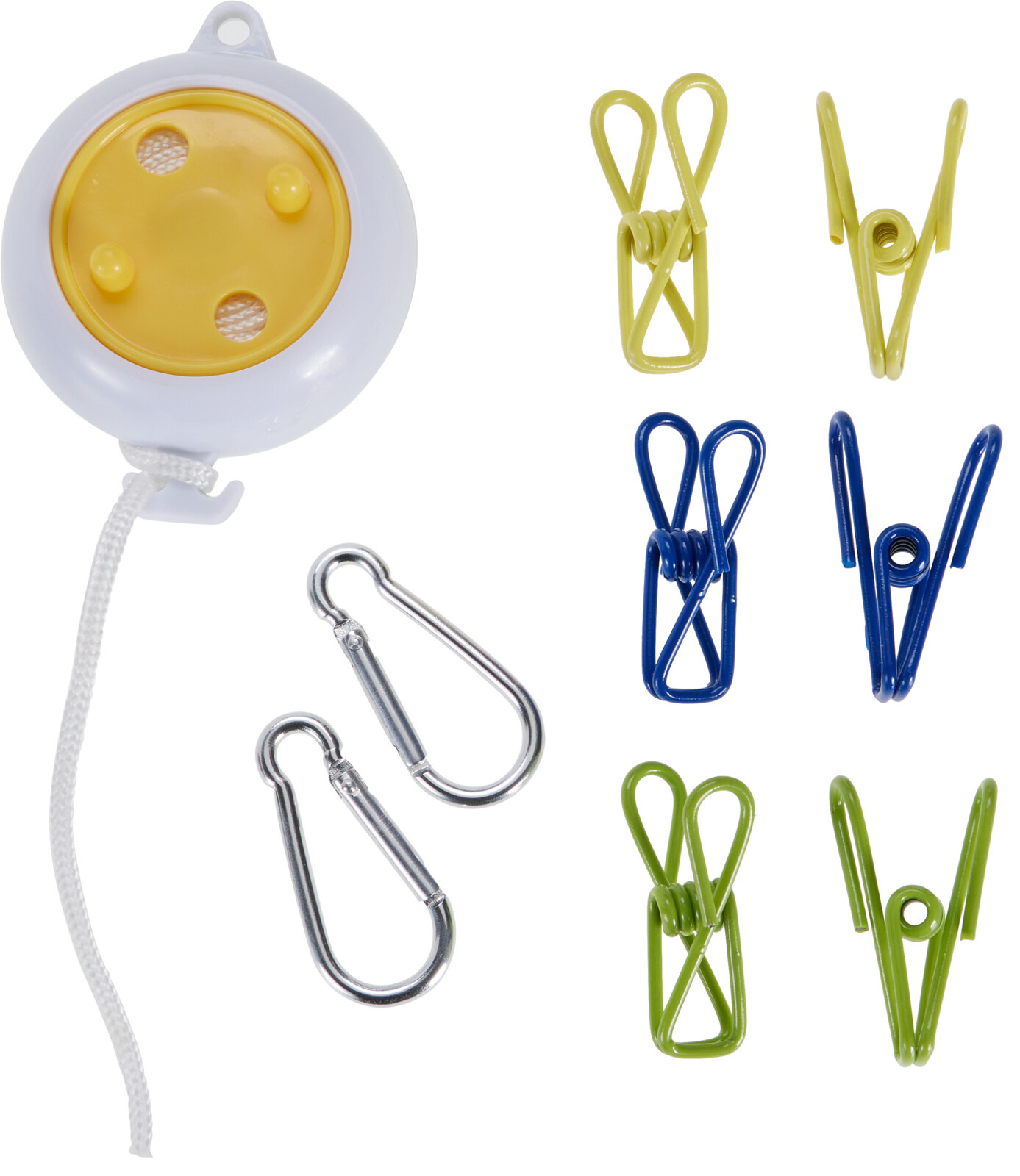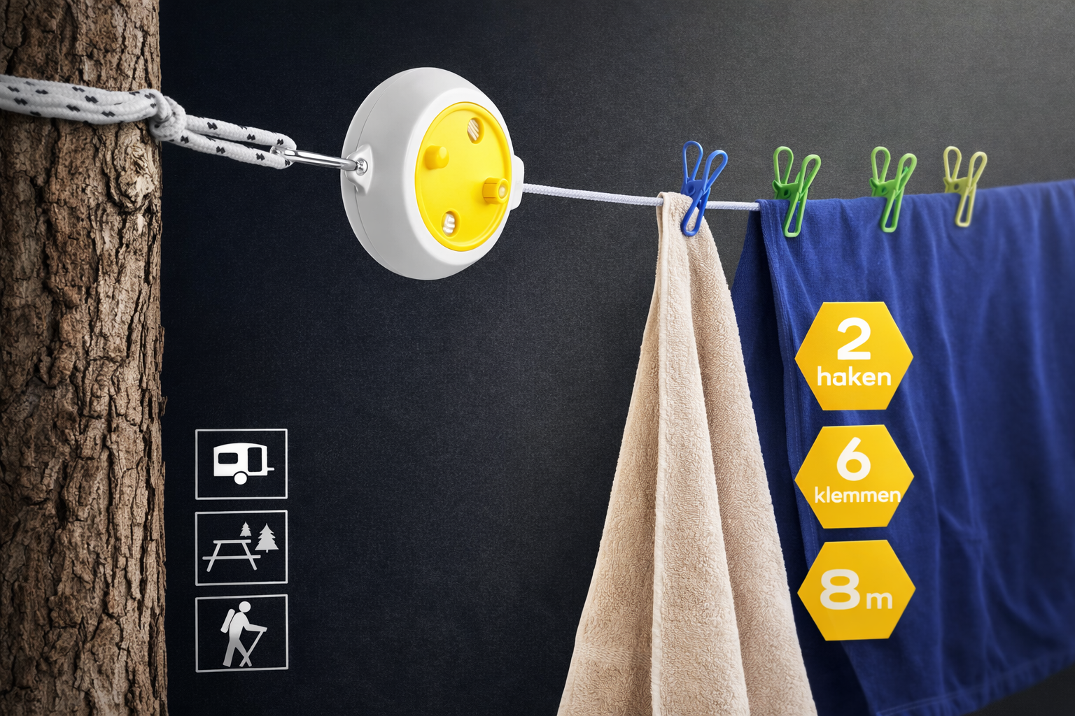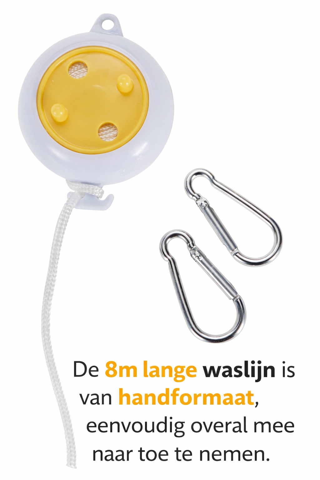 De waslijn is voorzien van 6 stevige klemmen die je wasgoed veilig op zijn plek houden. Hierdoor is hij ideaal voor sokken, handdoeken, ondergoed en andere lichte kleding. Met de meegeleverde karabijnhaken bevestig je de waslijn snel en zonder gereedschap aan vrijwel elk bevestigingspunt, zoals een boom, hek, douchewand of caravan.