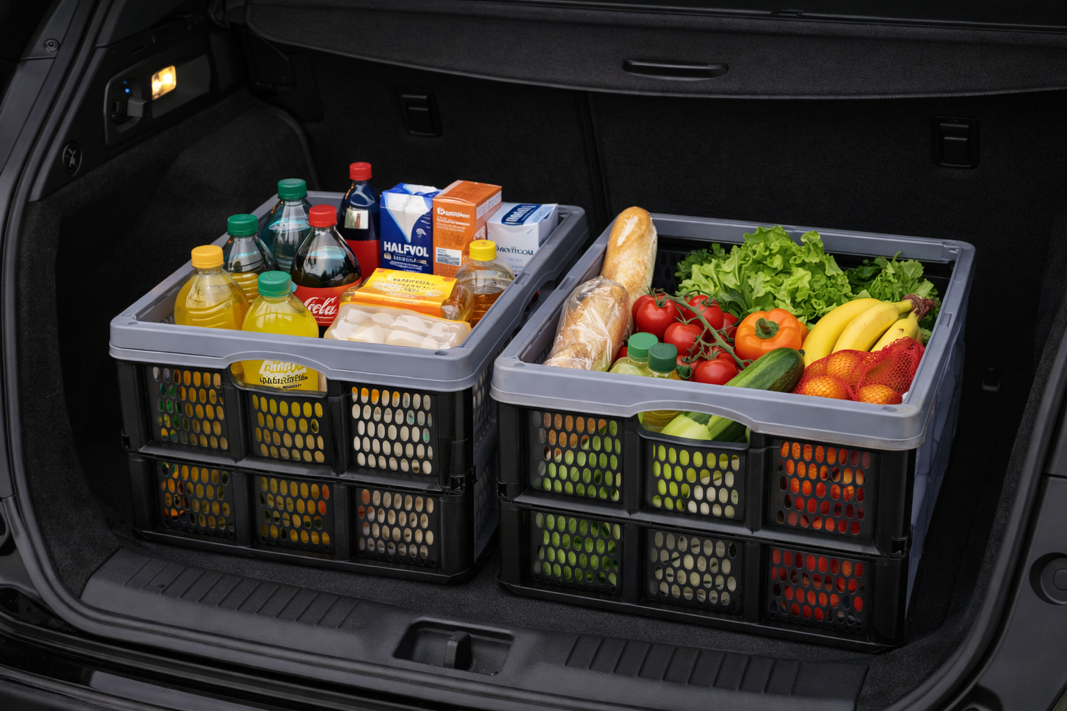 Dankzij het opvouwbare systeem klap je beide kratten eenvoudig in wanneer ze niet worden gebruikt. Opgevouwen nemen ze nauwelijks ruimte in beslag, waardoor ze ideaal zijn voor in de kofferbak, kast of berging. Uitgeklapt bieden de kratten samen een royale opbergcapaciteit van 2×32 liter, geschikt voor boodschappen, flessen, gereedschap, voorraad of losse spullen.