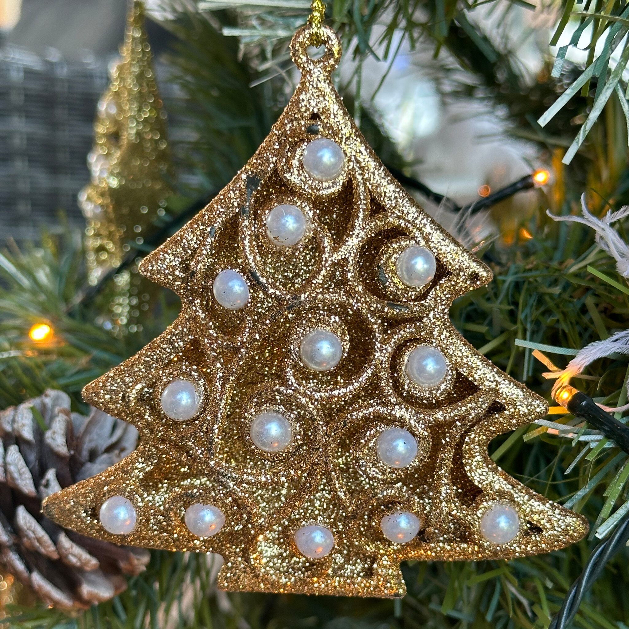 Deze kersthangers stralen elegantie en stijl uit met hun combinatie van glitters en parels. De glitters verspreiden een magisch, schitterend licht wanneer het licht erop valt, terwijl de parels een subtiele, chique touch toevoegen.