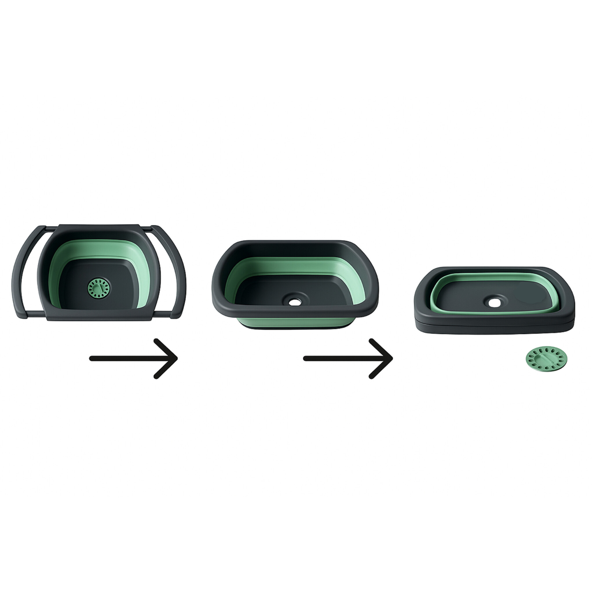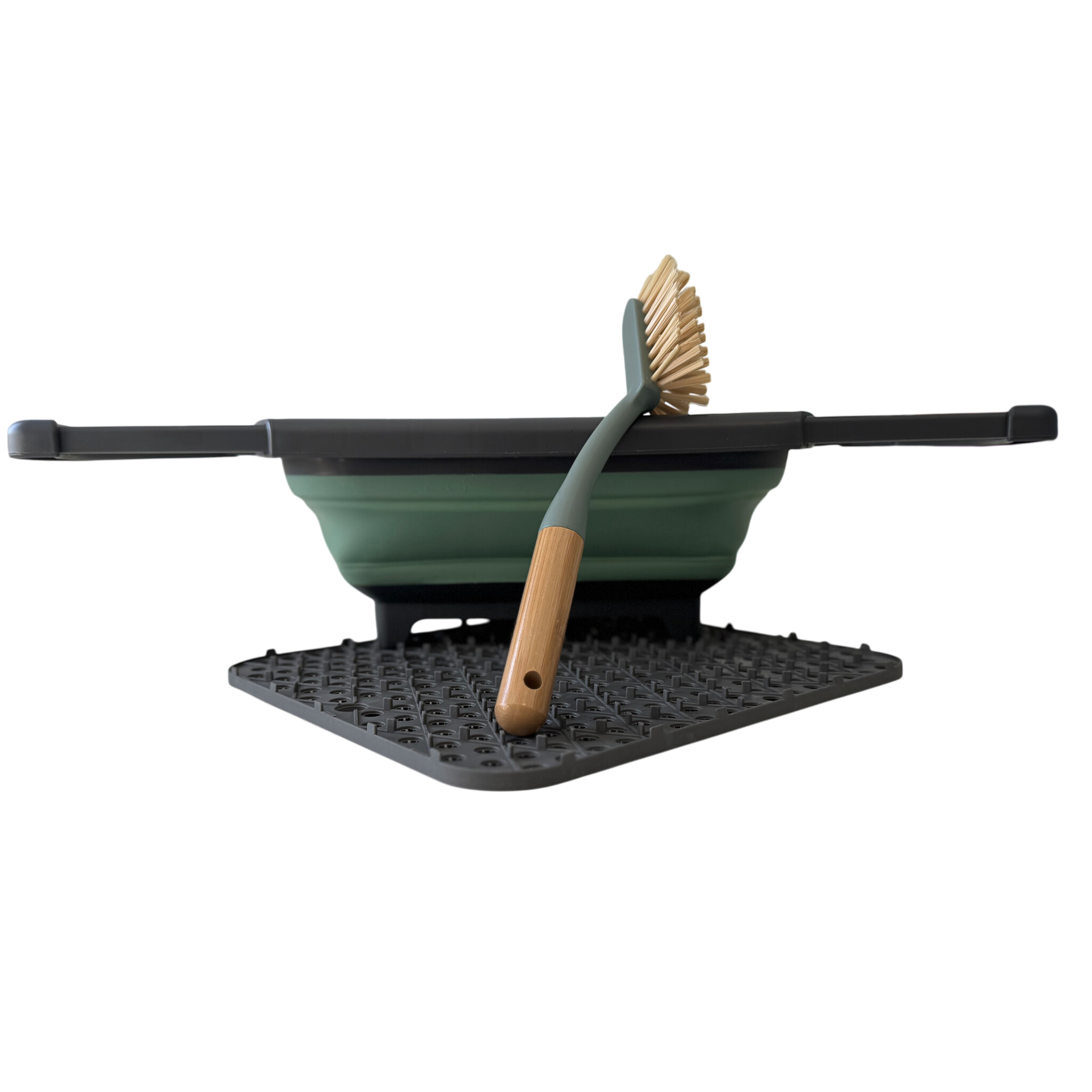 Maak afwassen en afdruipen comfortabel en efficiënt met deze complete 3-delige set. De set bestaat uit een opvouwbare afwasteil van 8 liter met ingebouwde stop en handgrepen, een duurzame bamboe afwasborstel en een siliconen afdruipmat in grijze kleur van 29,5 x 26 cm. Perfect voor gebruik in de keuken, op de camping, in de caravan, camper of op de boot.